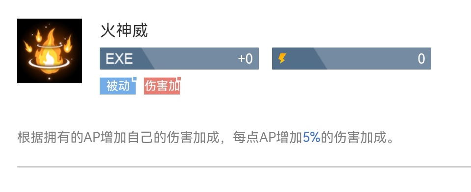 根据拥有的ap增加伤害,每点ap增加5%伤害。完美配合奥义技能。使用奥义最少加成30%伤害,最多50%伤害。(搭配奥义的神技)