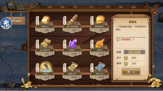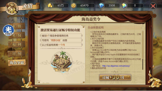 2、月卡必须使用的购买白胡子团打海岛和海岛月卡,方便拿到更多的金币换附魂卷子和宝石袋。