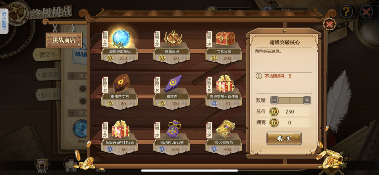 最低能获得350挑战金币。按最低标准计算250*5=1250 1250/350=3.5周 我们一个月时间可以突破完成5个限定人物。