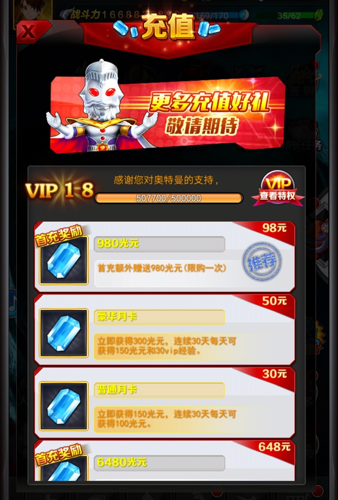 能够氪到v5.的玩家学生党居多,但是大多不是小学生,开服氪月卡慢慢苟,加上每天的一元限时礼包,实质上可以等同于六元,可以连续5天在豪华签到领vip经验,这个算下来v5也就不到500,加上折扣券的也就300-400不等,到了v5就直接玩ul,这是最低起步,但是好歹能玩兽贝海帕等老一代ul,抽卡装备存光源就行了,用时间砸,全红不是梦。再往上就是较豪的玩家,除了每个月的豪华月卡,基金是最划算的,毕竟有光源的情况下除了红变和飞机,基本解千愁。然后可以考虑买一架飞机448,一个就行,多了没用。玩兔子雷杰多贝流这种红变ul就得做好至少氪448*2的准备。