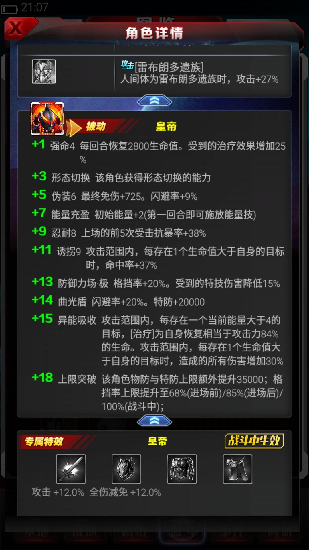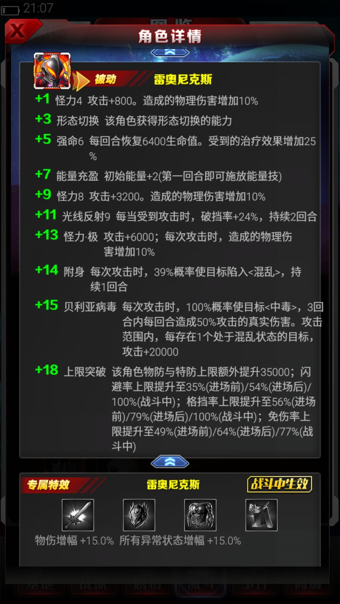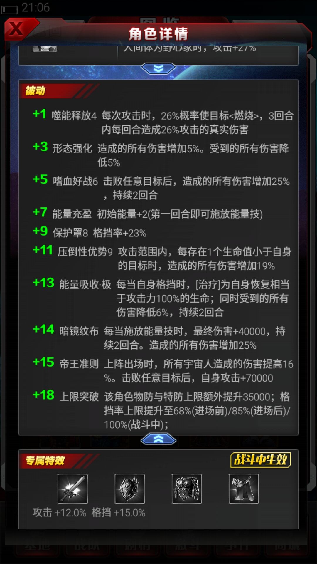 +15异能吸收,对生命之大于自身加伤,对能量大于4目标造成伤害自身回血