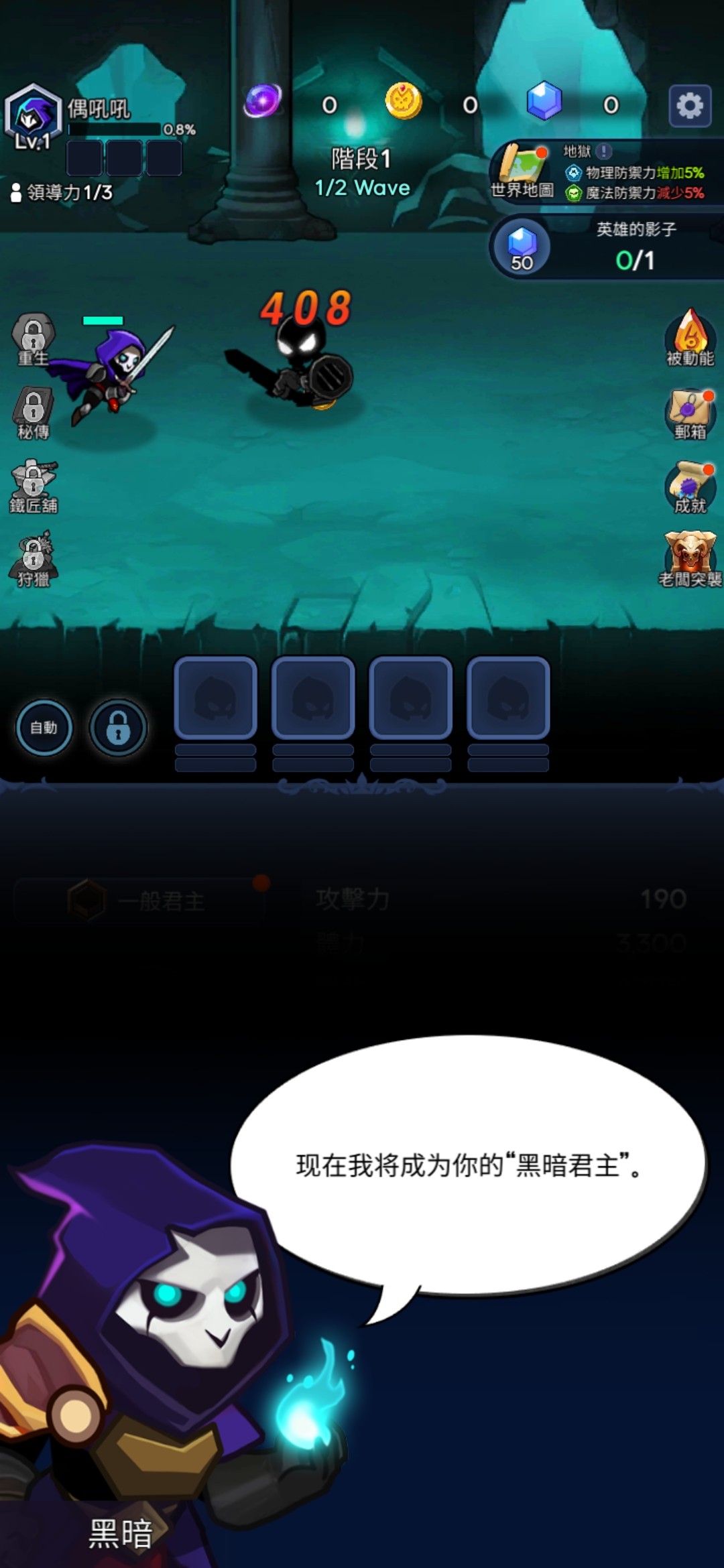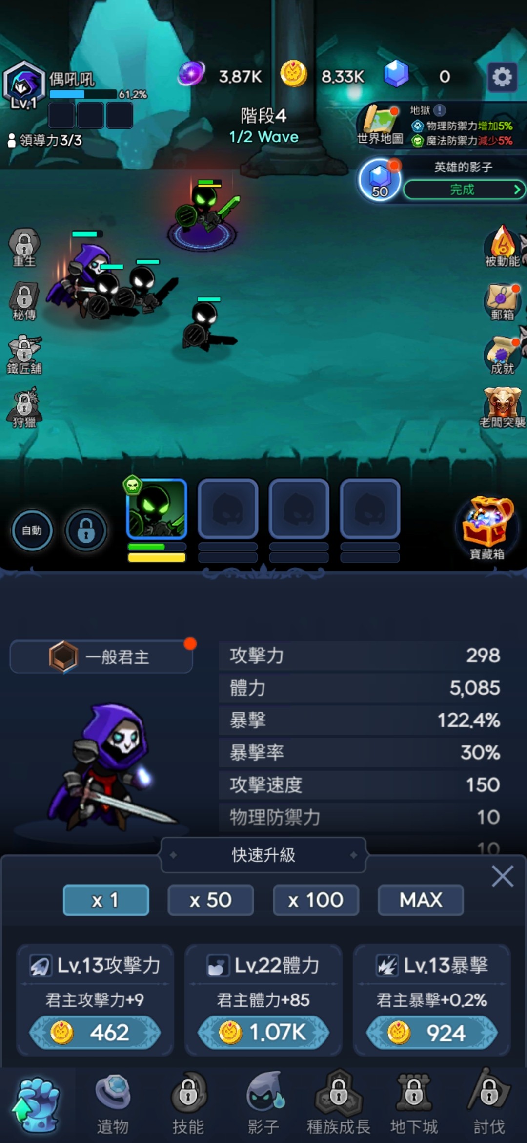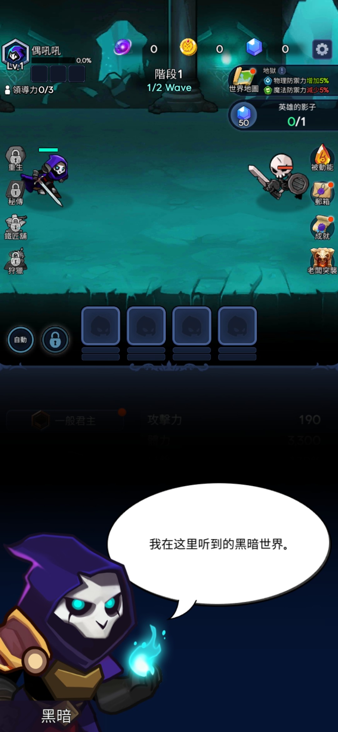 游戏开始,我们将会以这个骷髅法师的身份出现在游戏中,不得不说,这个人物设定的还是比较难看的哈。游戏画面布局,将会是按照两个大模块同时进行的,上半面,法师将会召唤它的影子军团和它一起去对抗其他的小怪物,而下半面,我们可以对法师和影子军团提升等级和战斗力,这两部分可以同时进行,此外,游戏中还有很多的其他的武器和技能,等你来探索哦。游戏的玩法很简单,有种在玩二次元闲置手游的感觉,不过这个和二次元的手游还是有些差距的,游戏的画面不是大制作的场面,但也能看出来也有用心设计。