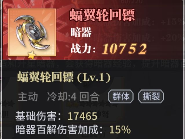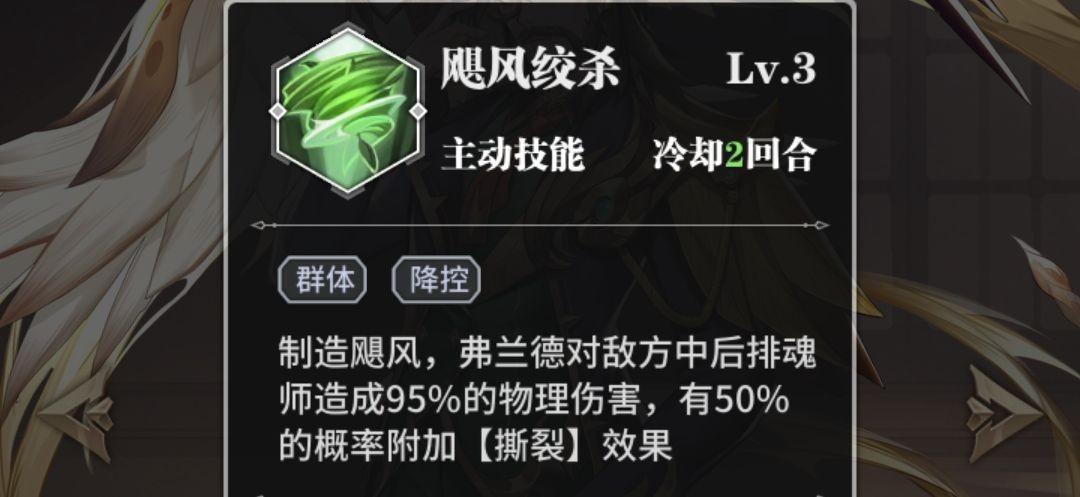 回合开始时,有40%概率触发,随机对敌方4名单位造成两段攻击,每段造成20084的真实伤害,且有20%的概率造成[撕裂],效果持续两回合;第二段对带有[撕裂]的单位额外造成15%的伤害。(开局有概率添加撕裂,增加全队效益)