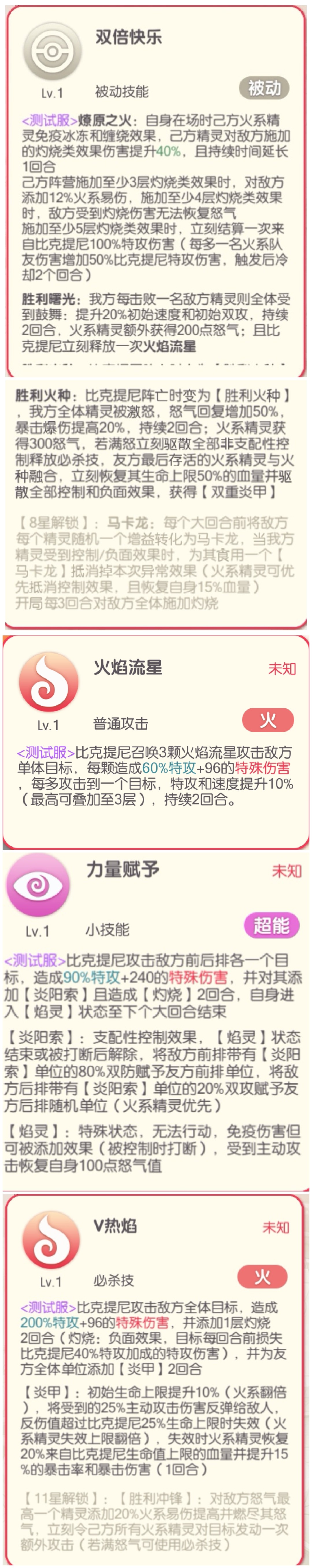 比克提尼个人认为是一个很尴尬的精灵,本身作为辅助当然是存活越久作用越高,但是它因为有一个献祭机制,所以生存能力差,但过于差导致它经常两下暴毙似乎没有什么存在感。 虽然能驱散队友控制,但一般更多驱散的是火系,而S+和SS的火系精灵里除了固拉多其他的也不太需要解控。本身伤害不稳定以外,最为强力的控制效果也不稳定。 十一星的效果由于是单体限制,并且邀战只能作用于火系队友,目前并没有什么火系的输出神兽。 所以真的是太尴尬了。