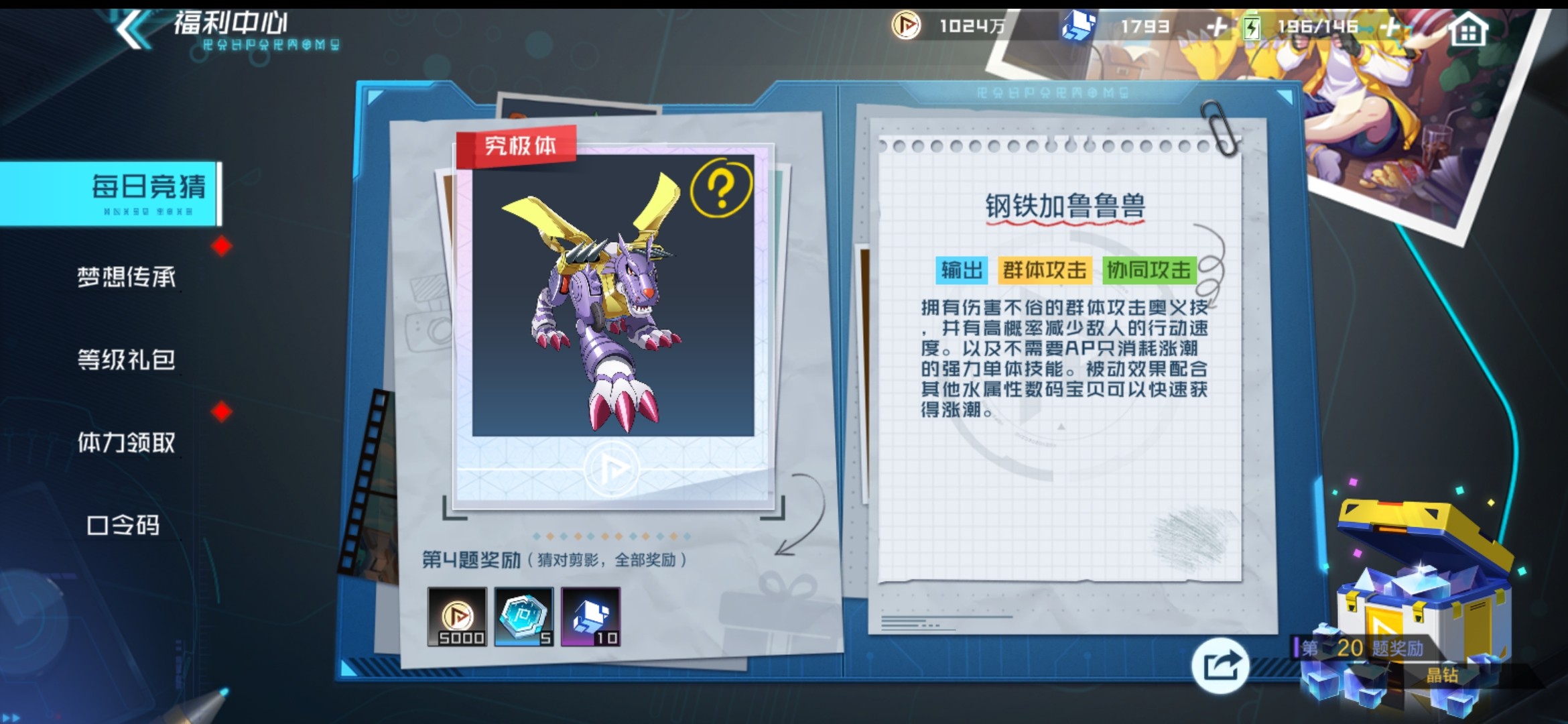 up有许多的活动奖励没拿,正常的话已经5只究极体了。