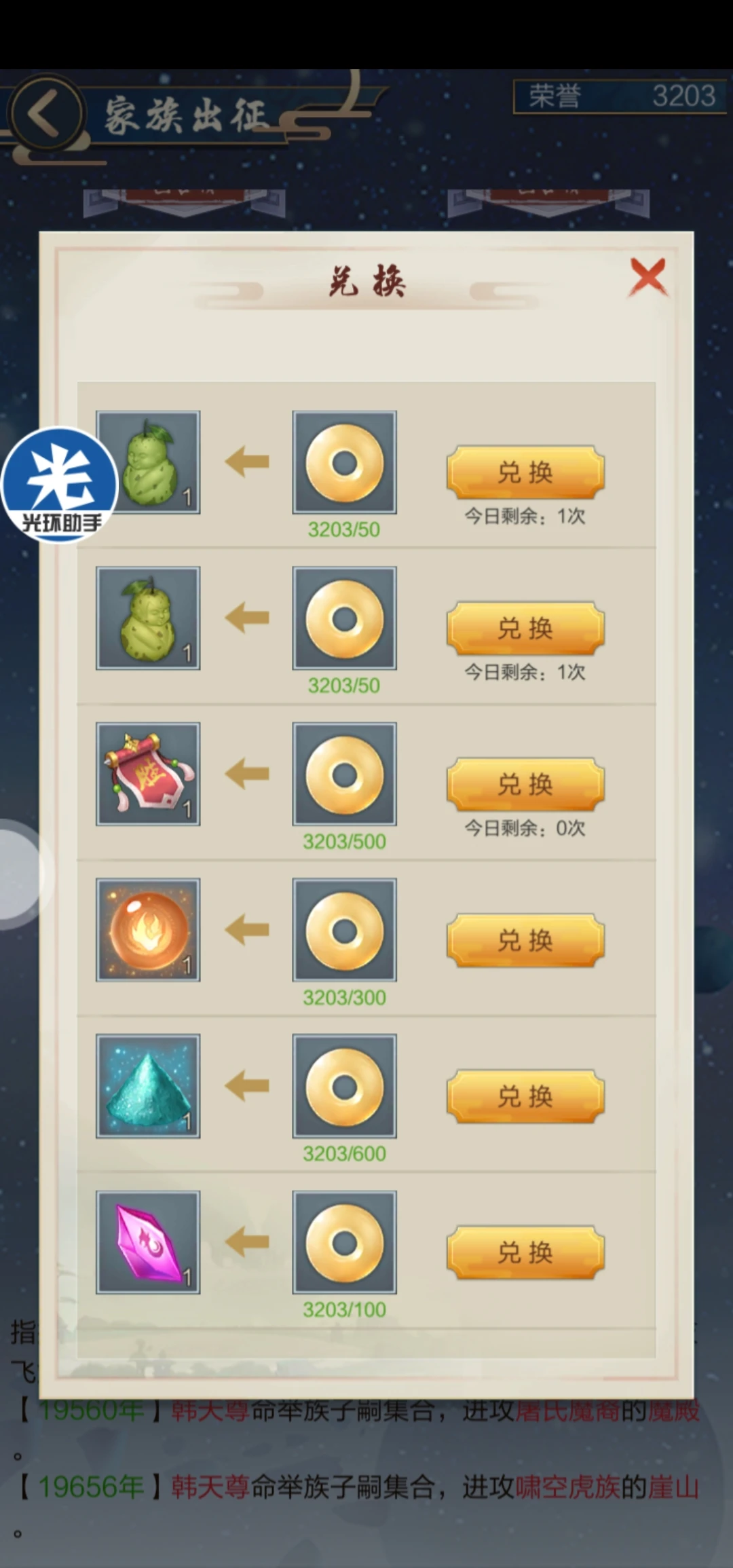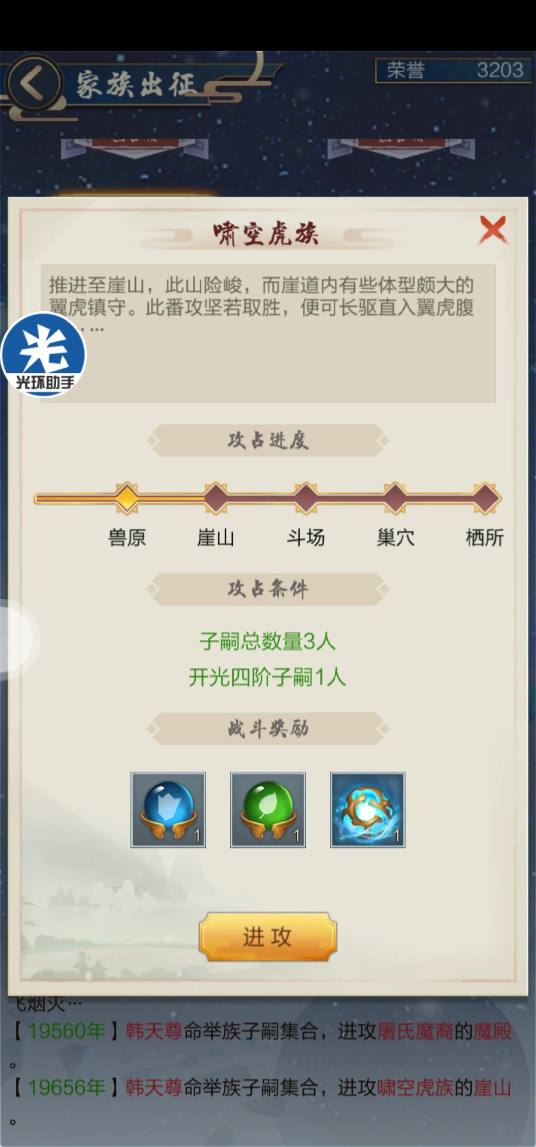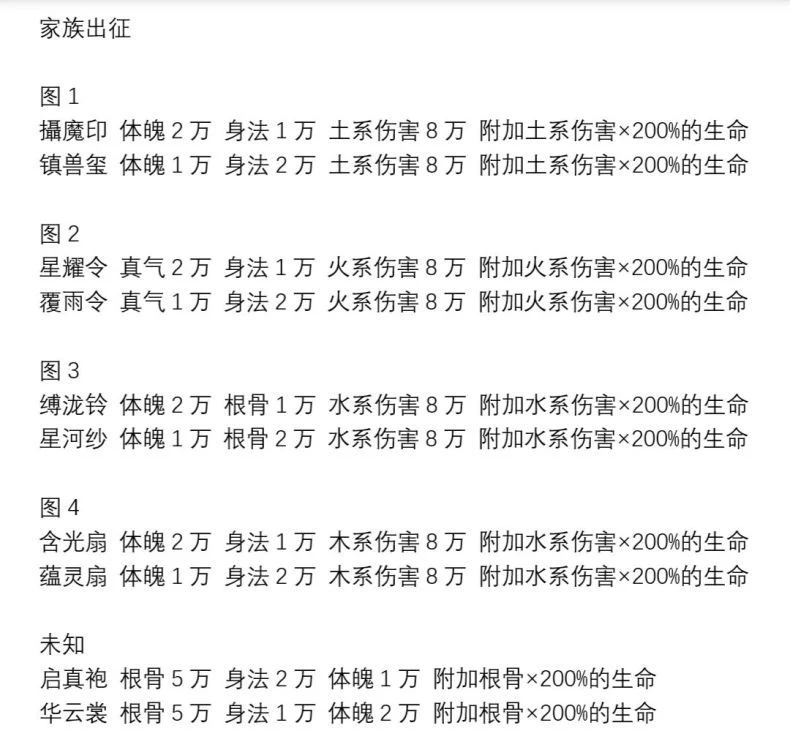 3、家族出征:这个家族出征可以理解成弟子的历练图,总共20张图,每张图有5张小图,所以这就是儿子需要提高属性的原因。