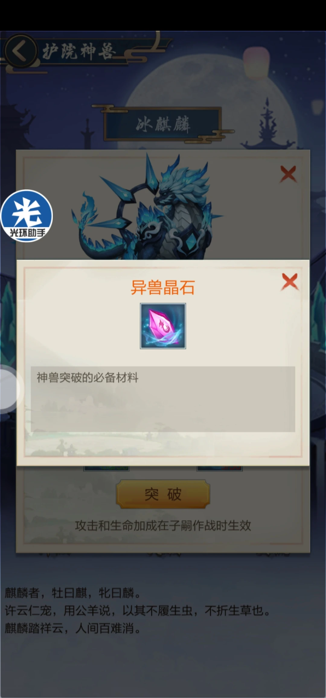 突破:突破就是等到境界升到一定程度,需要用材料升级(与道使差不多)。神兽突破需要两种材料:异兽晶石与异兽灵核。