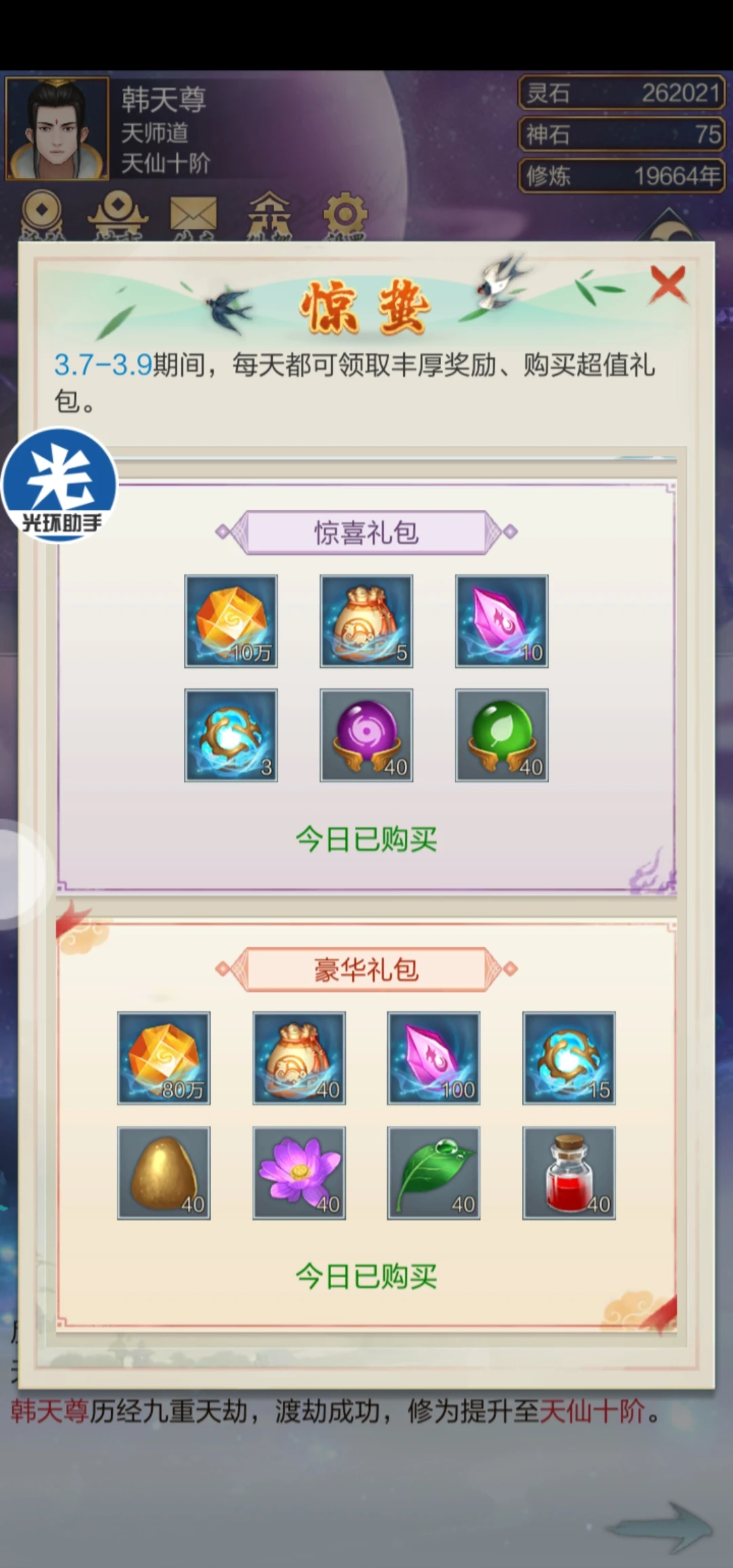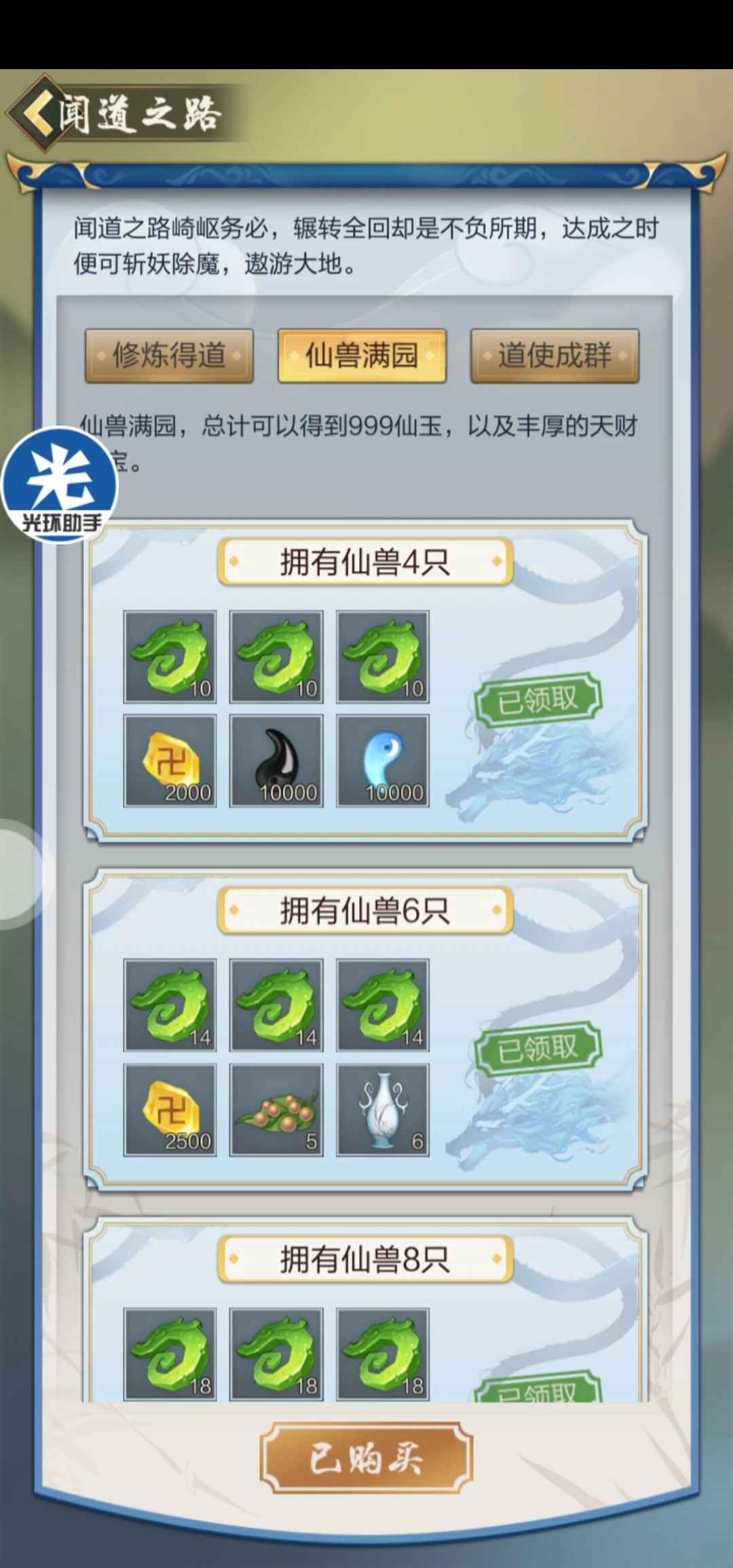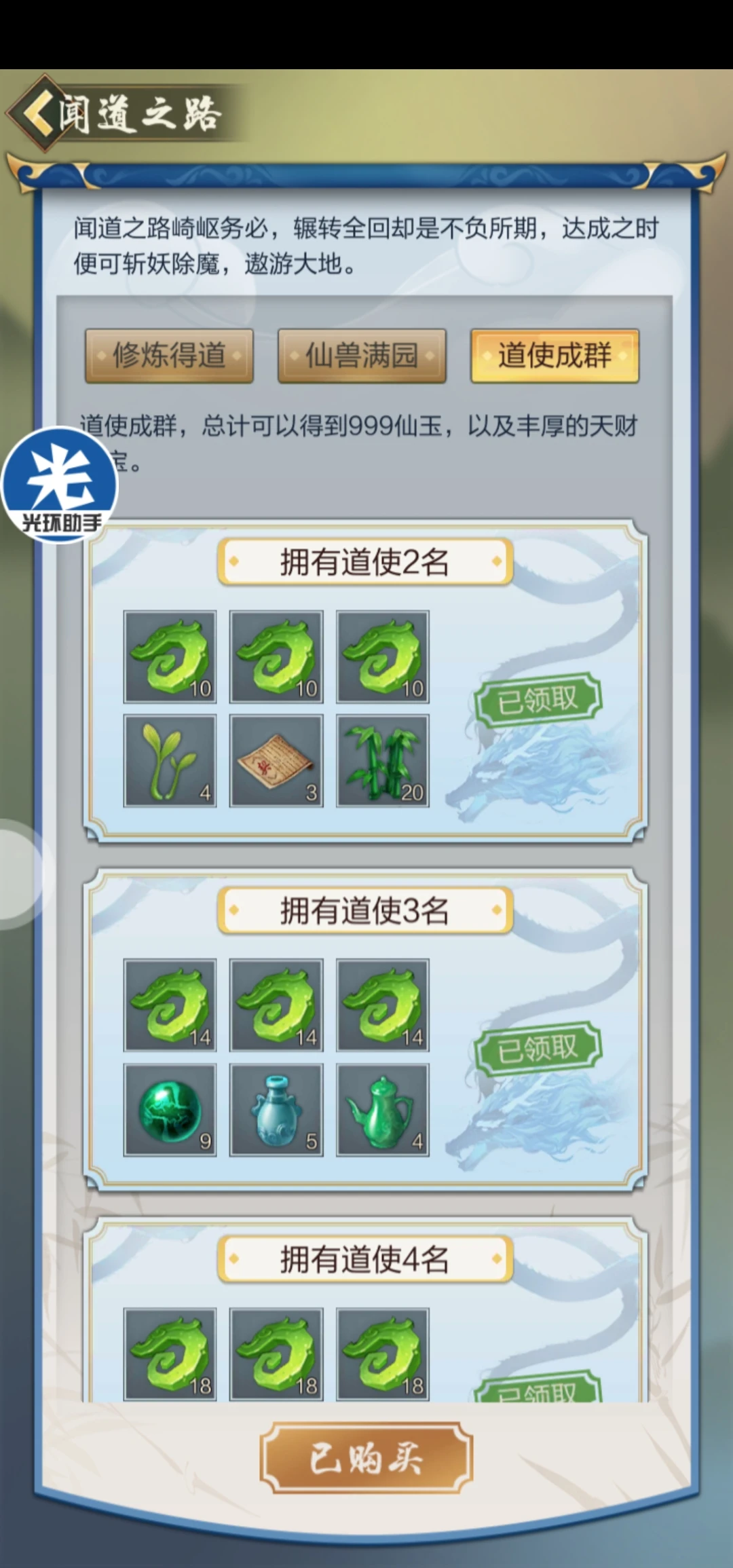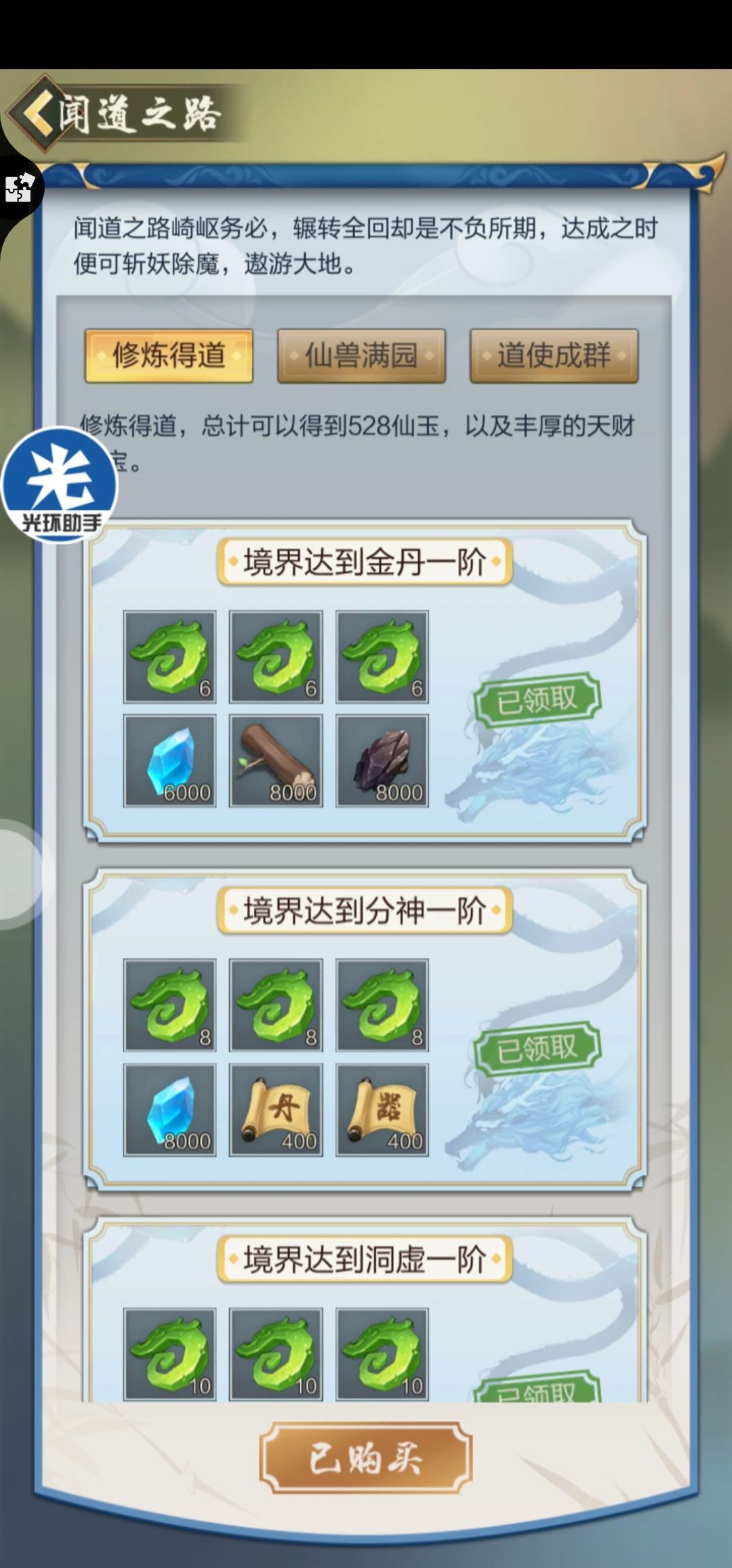 5、闻道之路:这个是新推出的需要氪金的东西。需要玩家充值98/198/198激活三个,最终会得到528/999/999仙玉。