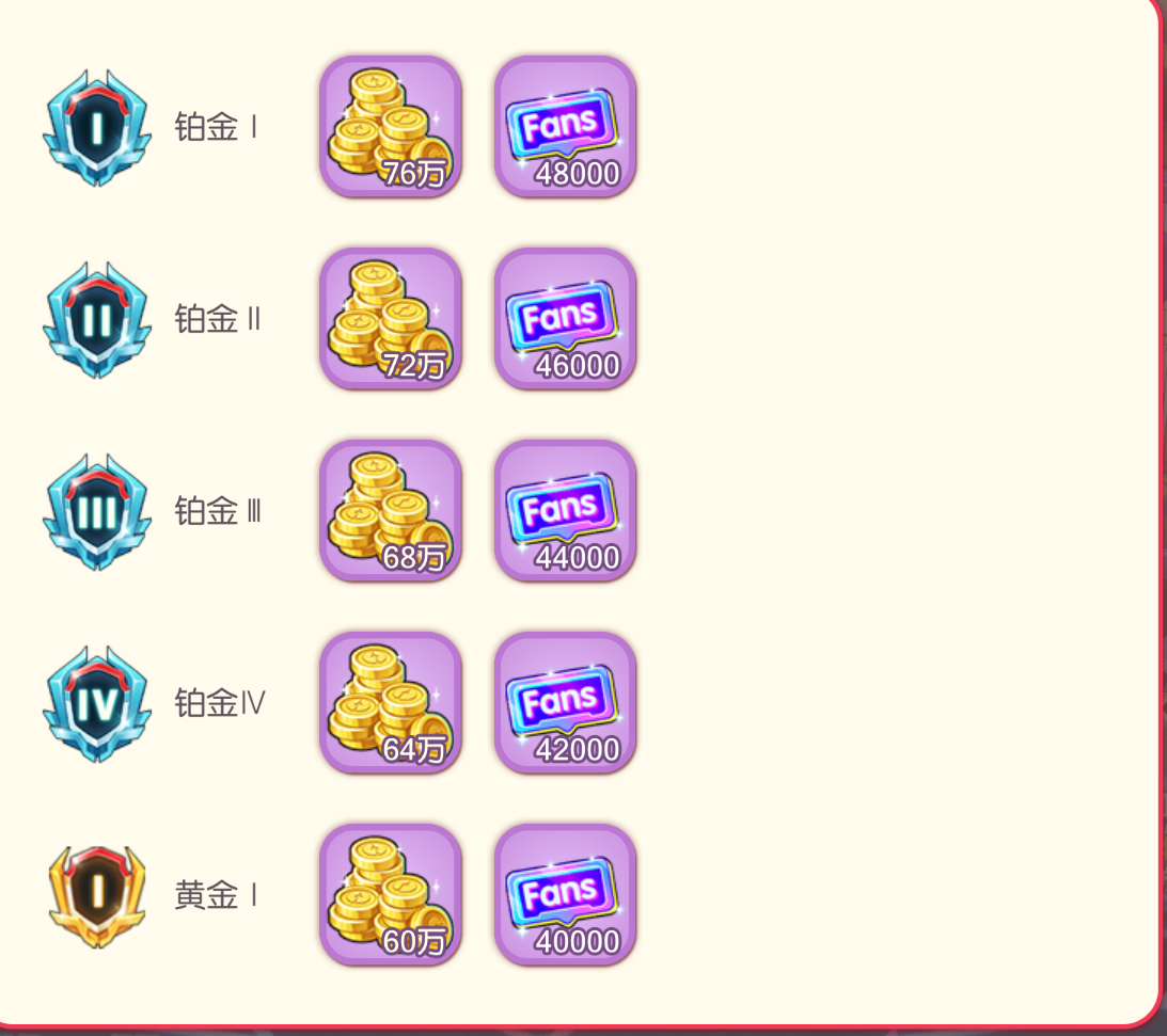 根据玩家段位,每10分钟可产生一定段位奖励,段位奖励存在上限上限为相应段位对应24小时的产量,请及时领取哟;荧光棒可领取为等量的金币三、[赛季排名和奖励】