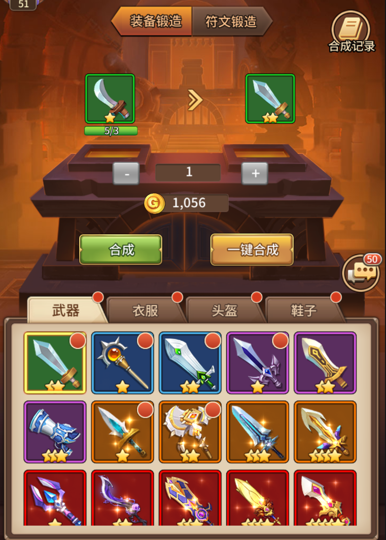 前期英雄的装备有啥带啥,不需要花资源买或者合成。即使合成也只需要把蓝色和绿色装备合成为紫色1星装备即可,然后放入公会宝库换取勇者凭证。只有橙3以上的装备才有合成的价值,但是合成花费较贵,后期资源充足的情况下在合成装备。