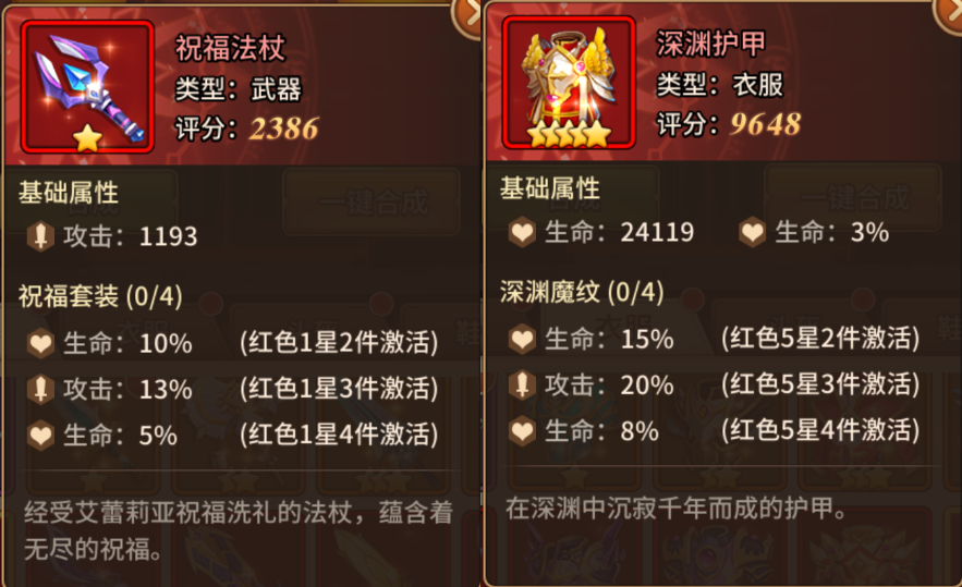 装备一共分为5个档次,6星红装为最高等级;装备2件开始会触发装备套装效果,并且向下兼容套装属性,什么意思呢,举个简单的例子,比如你现在带了1件红1的武器,1件红5的衣服,激活的效果就是1星套装的属性:生命+10%。