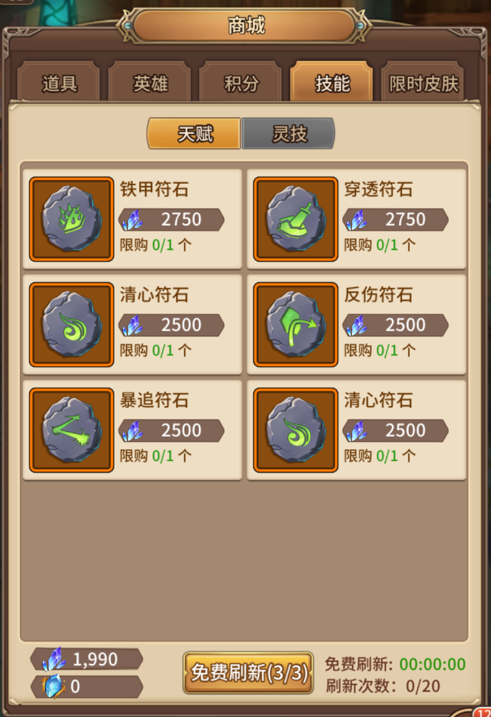 我们可以在技能商店里面购买天赋符石,每天有免费次数可以刷新,如果在精华充足的情况下,推荐大家尽量屯比较重要的天赋符石留着备用。