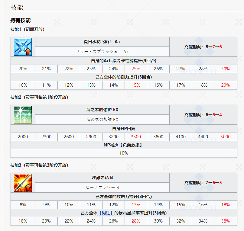 三技能「沙滩之花 B」效果为己方全体8%~18%攻击力提升3回合+己方全体男性从者18%~38%暴击星掉落提升3回合。