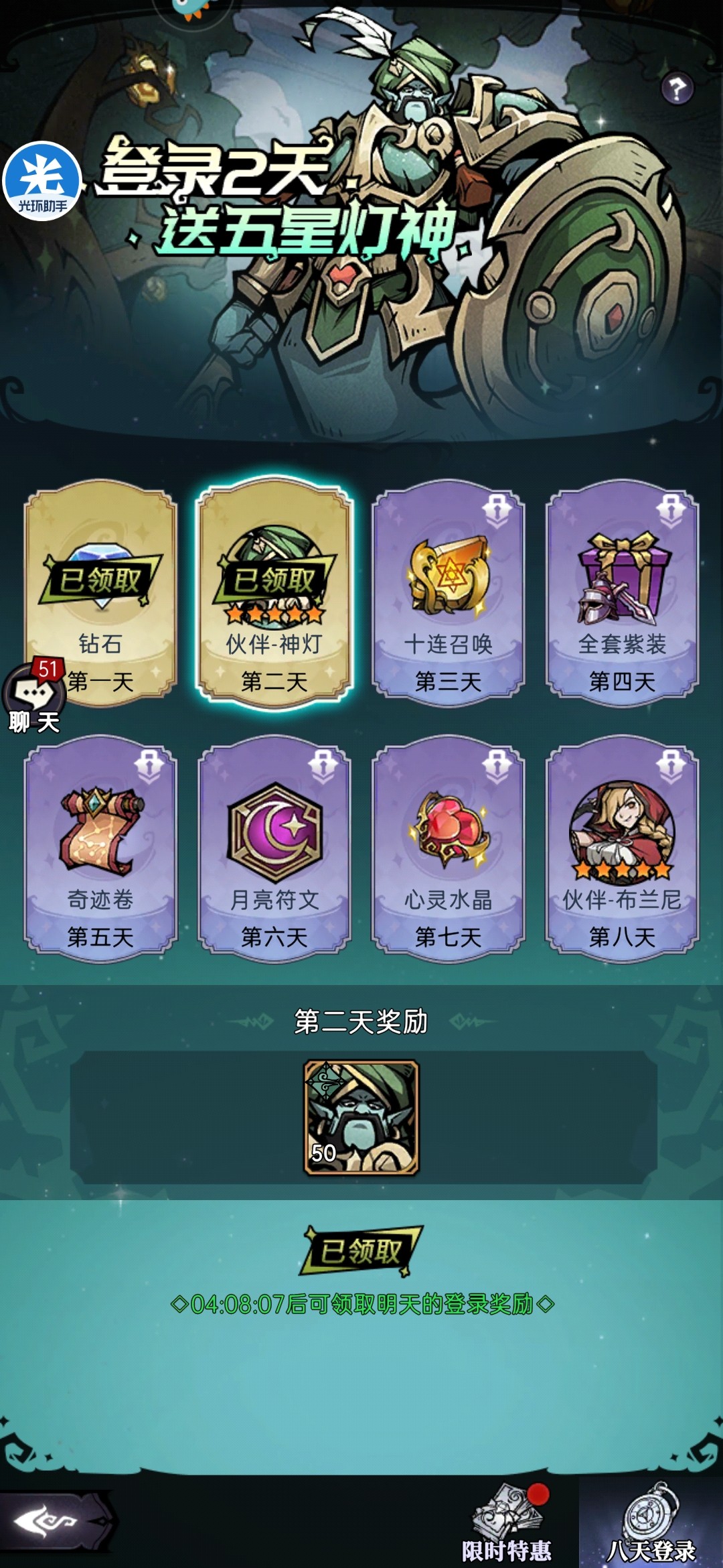 第二天登陆奖励一直风系坦克:灯神,特点:援护,回复,反击。灯神的表现在前期还是可圈可点的,尤其回复量可观,可以持续续航,如果第一天没抽出来坦克,完全可以先用着灯神,当然,还是以莫多为目标的好