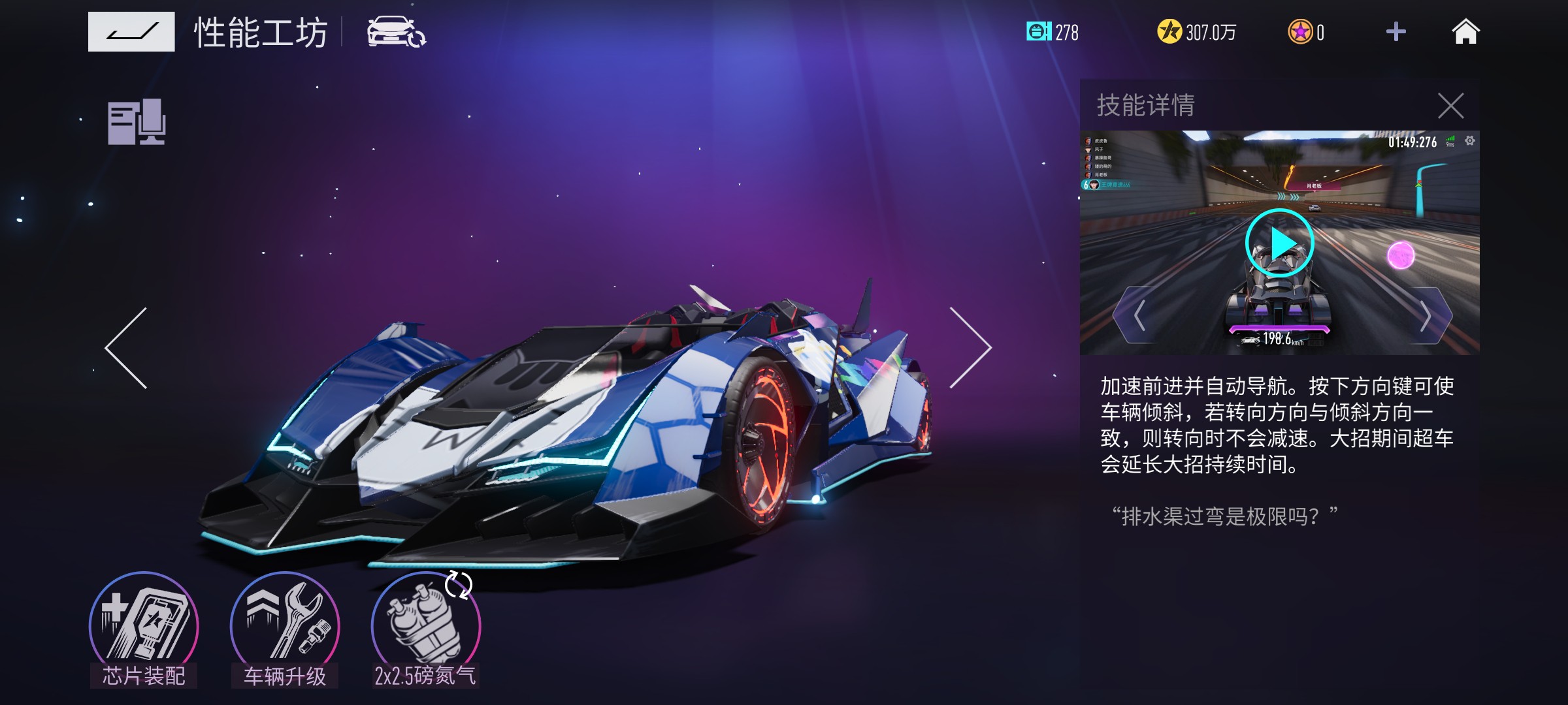 其中实用副属性占比很大一部分性能,该赛车转向速度快,在连续弯道释放大招可以快速过弯,在快速过弯的同时不会集气,需要用上我们的尾流芯片或进境芯片,增加我们大招一个稳定性与持续性!