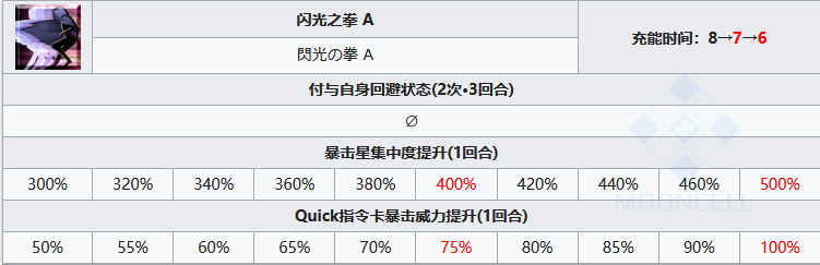 此技能的特点在于,次数限制的闪避将不会影响到输出的节奏,减少了为了闪避生存而开启技能浪费暴击增益输出的情况,暴击星集中和绿卡暴击威力提升十分契合自身情况,很优秀的技能。