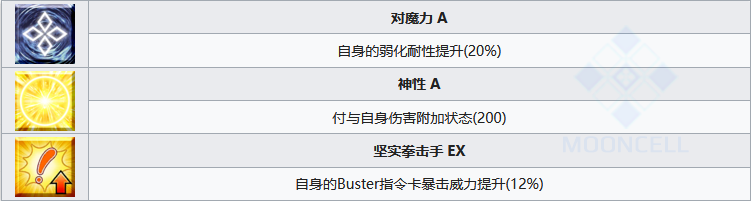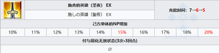 迦尔纳经典施舍的英雄,人物代表性技能之一,能赋予己方单体np增加和次数的弱化无效使得迦尔纳拥有一定的辅助能力,不过虽然说是施舍的,但大多数情况下还是给自己使用来减少连发压力合适。