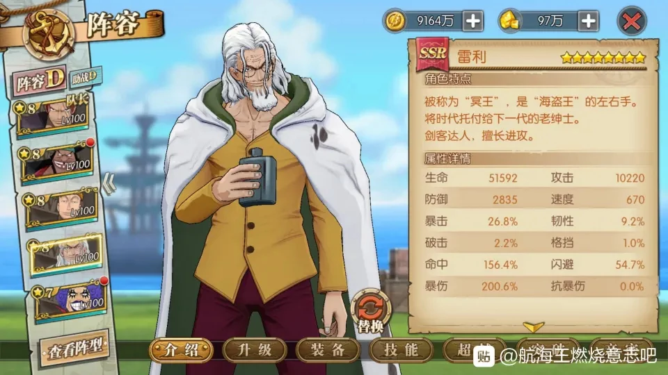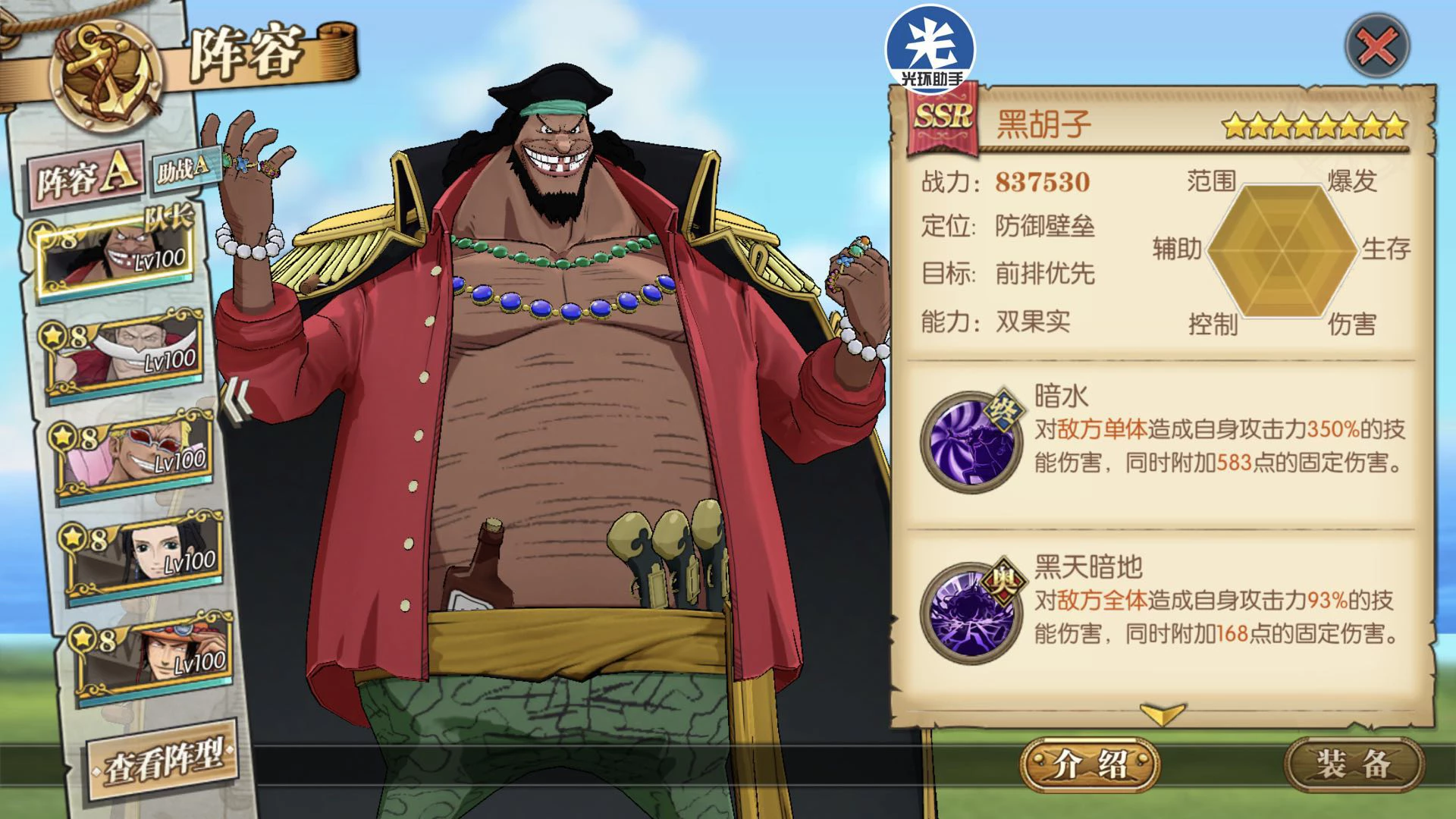 3、万金油类型的:说到万金油就少不了炎帝艾斯了,百级变身铠甲勇士后一手炎龙铠甲烧得主线BOSS嗷嗷叫,有一定的培养度后在天梯更是能打出精彩的七伤拳,抱着同归于尽的心为队伍争取胜利。唯一缺点就是不适合平民在前期就入手培养,且需要黑胡子霸霸的BUFF,但作为二队培养,绝对是不二人选。