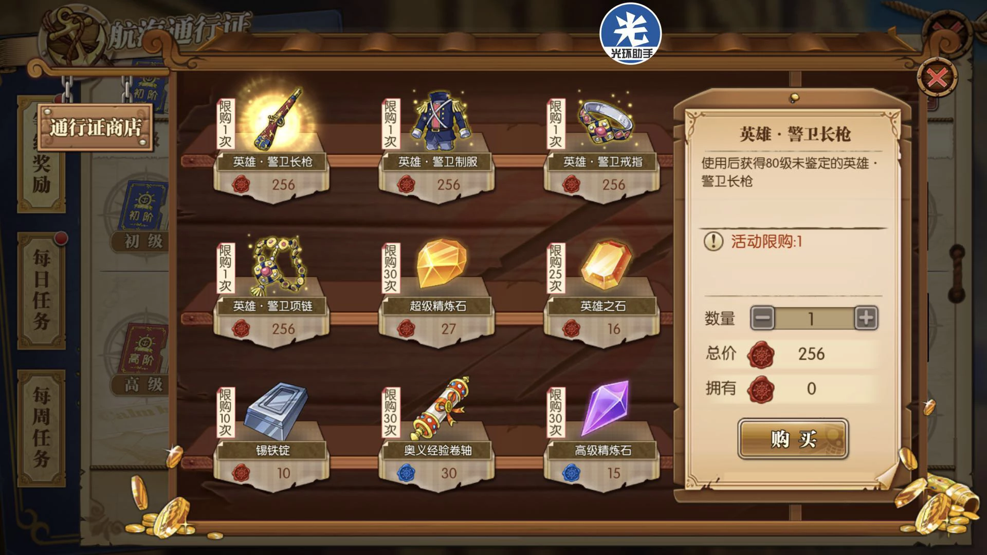 1、如果有适合的每回合7魂以上的输出角色,可以购买航海通行证兑换警卫套装,提高日常首领悬赏的伤害,争取拿到更高排名获得宝石奖励,日积月累,这笔资源可是十分可观的。