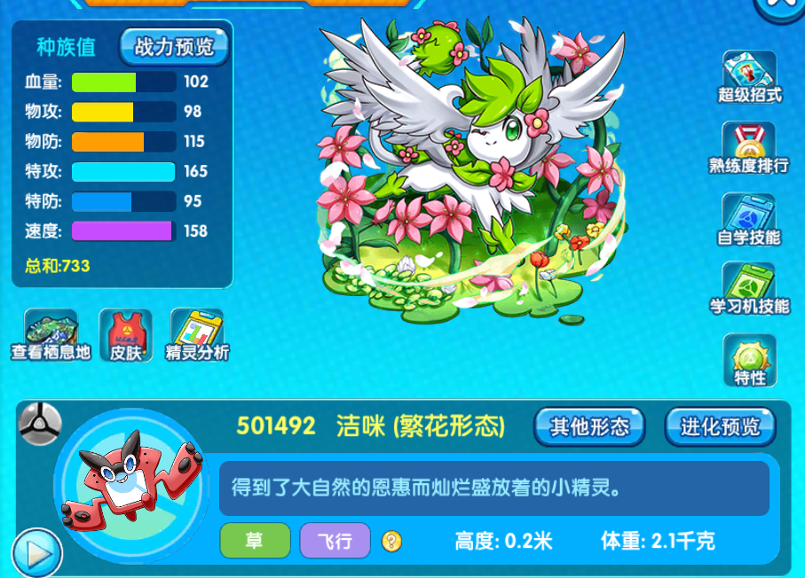 大家可以看到,这就是洁咪的新形态,速度算是很快了,基本上在平民宠速度的上限,但是对于土豪来说,这个速度线不算是很快,而且输出也算是很低的,因为目前草属性的打击面是很不好的,基本上虚无伊德,再加上水箭龟就可以轻轻松松联防了,所以说真心很一般呐,这个精灵,不过也拥有专属特性,不过感觉是在画蛇添足一样
