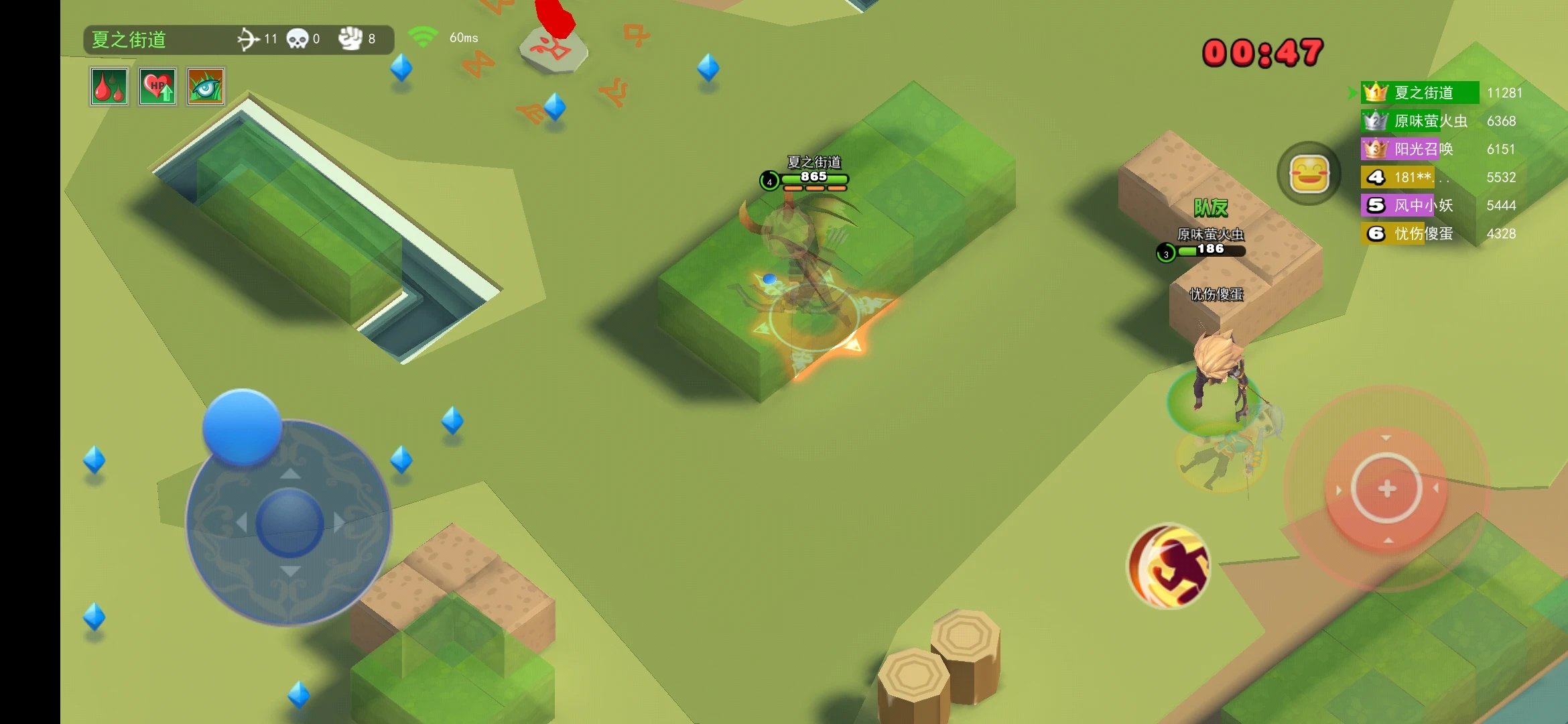 八人战场就是八人生存战场,在这个不大不小的空间中有着遍地可占领的经验水晶、有着作为障碍物而存在的石头、有着隐藏自己的草丛,花费一些时间占据这些水晶可以让你的弓箭手升级,升级后河神将会问你:“小伙子,你掉的是这个吸血啊?还是这个冰箭?还是这个攻击力加成呢?”呸!哪来的河神,那是策划赏的,有关于这些技能其实有很多类型,我们后面再说。