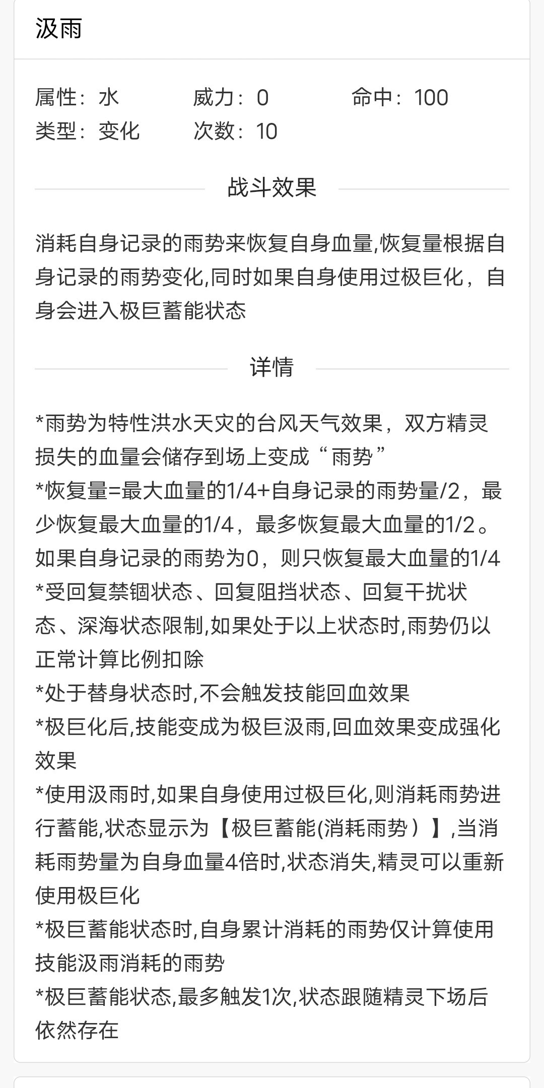 最后一个效果双方受到伤害累计将其中50%转化为“雨势”这个效果可以保存在场上,然后使用特殊的专属新技能用来回血,
