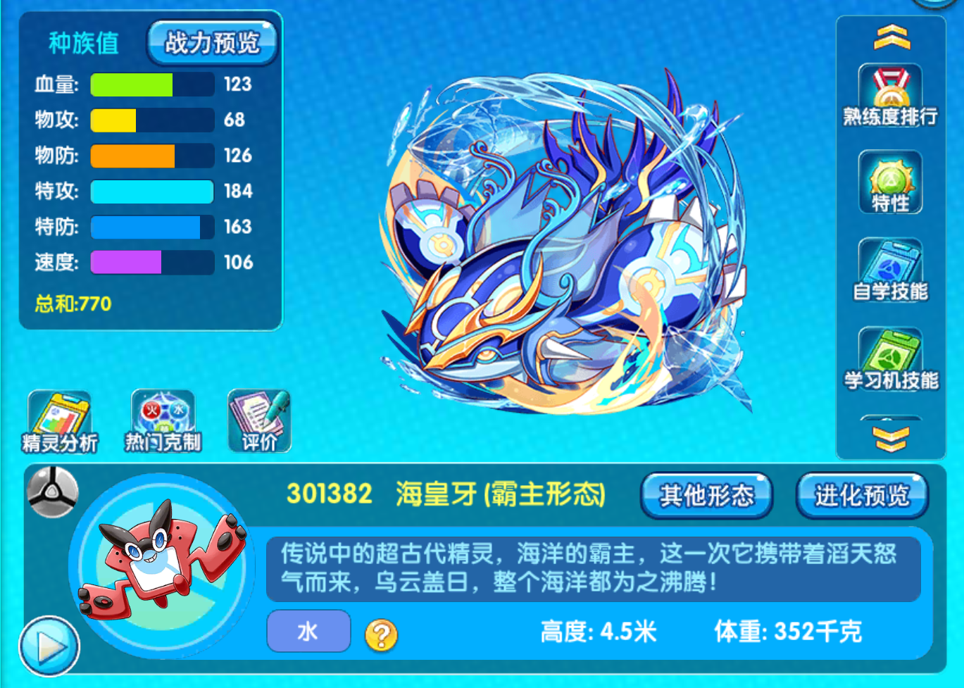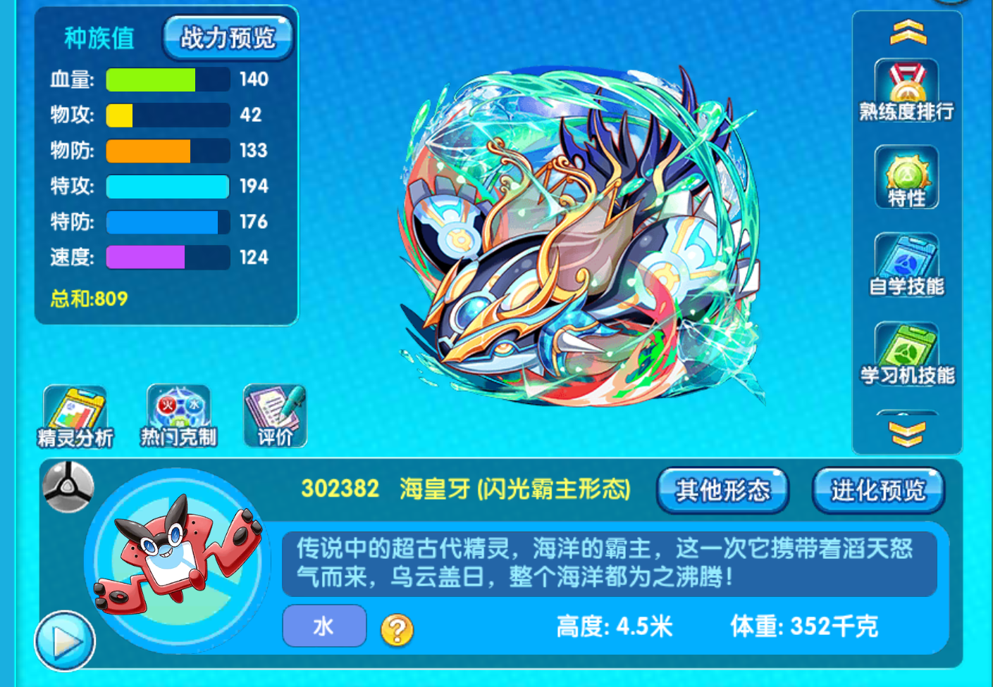 总的来说,海皇牙这个面板加强了防御能力和攻击能力,把原来的一些无用的种族值分配到了有用的上面,比如说原来的物攻相当的高,现在给他砍掉了,血量有了明显的提升,然后伤害也提高了,速度方面还是老样子,并不是特别的快,也只能说没有任何的变化,甚至是还不如接着砍掉一点速度,然后转移到物防上面,我个人认为可能会更好一点