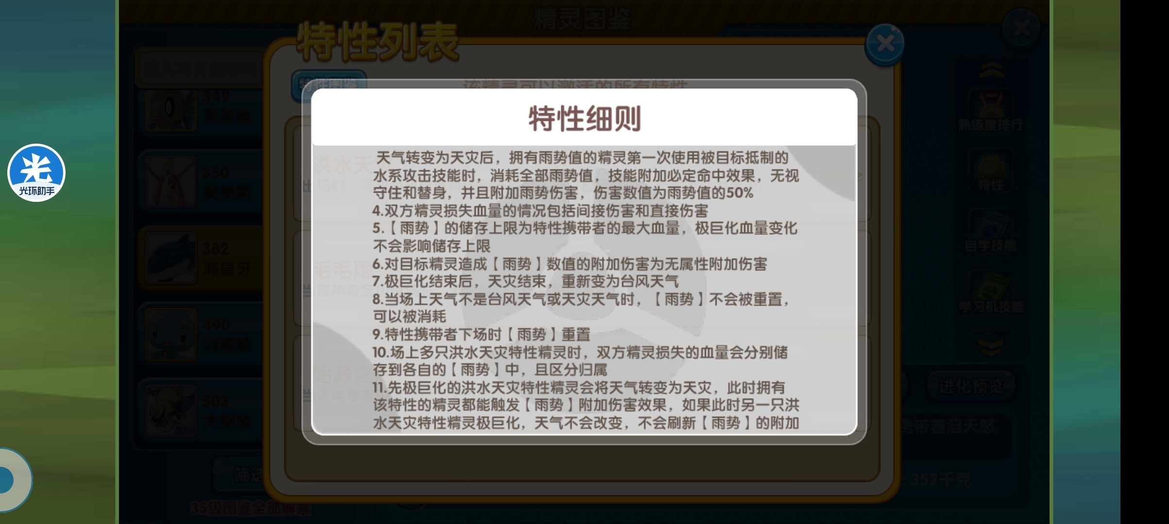 大家可以看到,就是这个技能了,这个技能不仅仅可以帮助海皇牙进行回血,还可以让海皇牙拥有极巨蓄能能力,而且天灾天气效果也就是在三回合极巨状态下才能够打出来