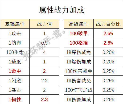 属性具体加成如下,左边为基础属性加成,根据数值提升提升战力值;右侧为高级属性加成,根据数值/百分比提升战力百分比