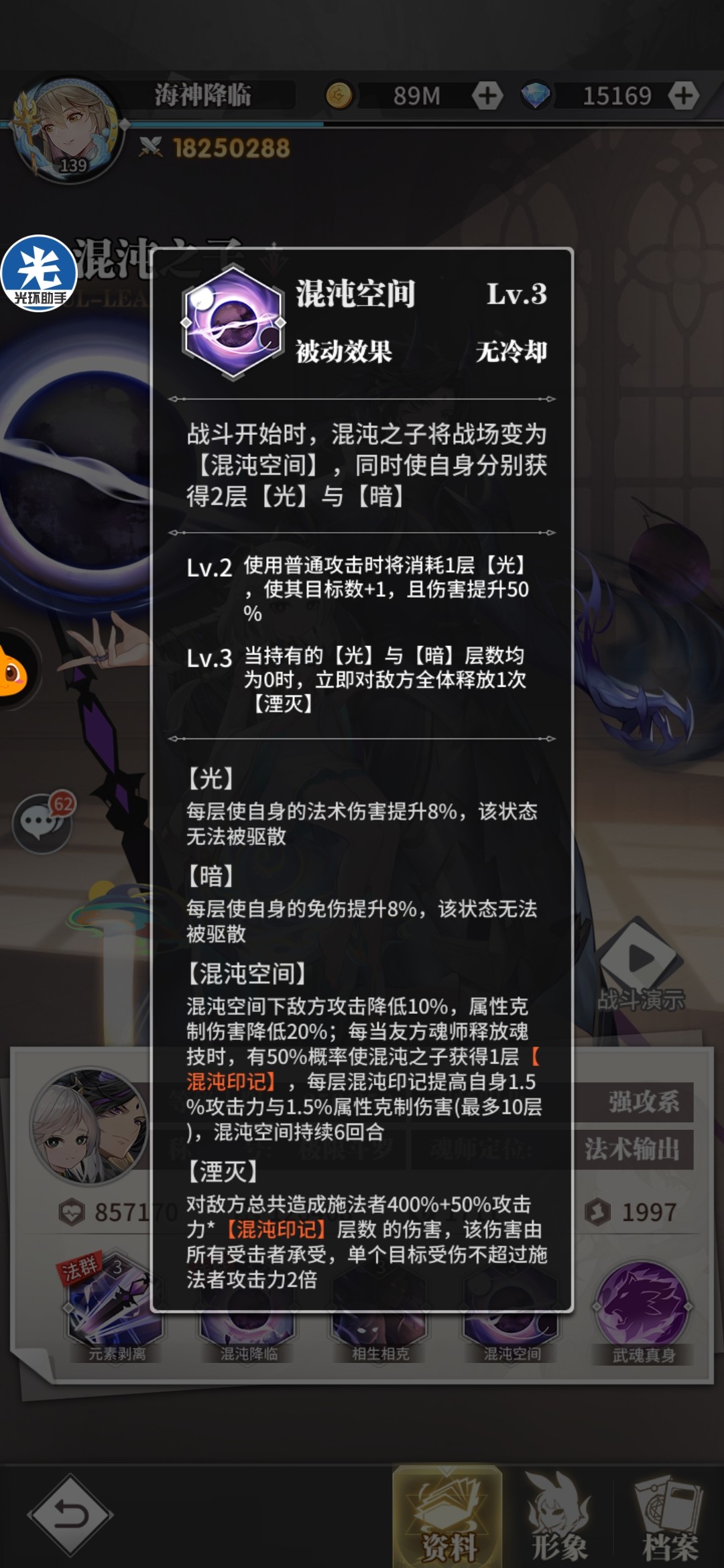 2、混沌降临,消耗1层光,群体AOE伤害,暴击高、无视30%防御,缺点CD4回合较长