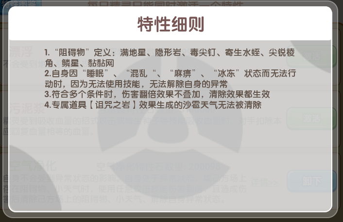 空气净化:自身不会受到异常状态的影响。自身处于异常状态、或己方场上存在阻碍物、或存在小天气时,使用任意攻击技能伤害翻倍,且造成伤害后解除自身的异常状态、清除己方场上的阻碍物、小天气。