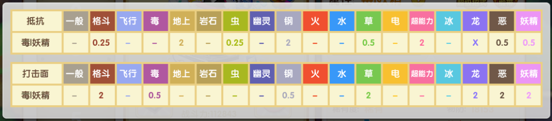 打击面:毒+妖精的打击面中规中矩,主要输出点还是在妖精,避开毒和钢属性的精灵,攻坚力量依然不容小觑。