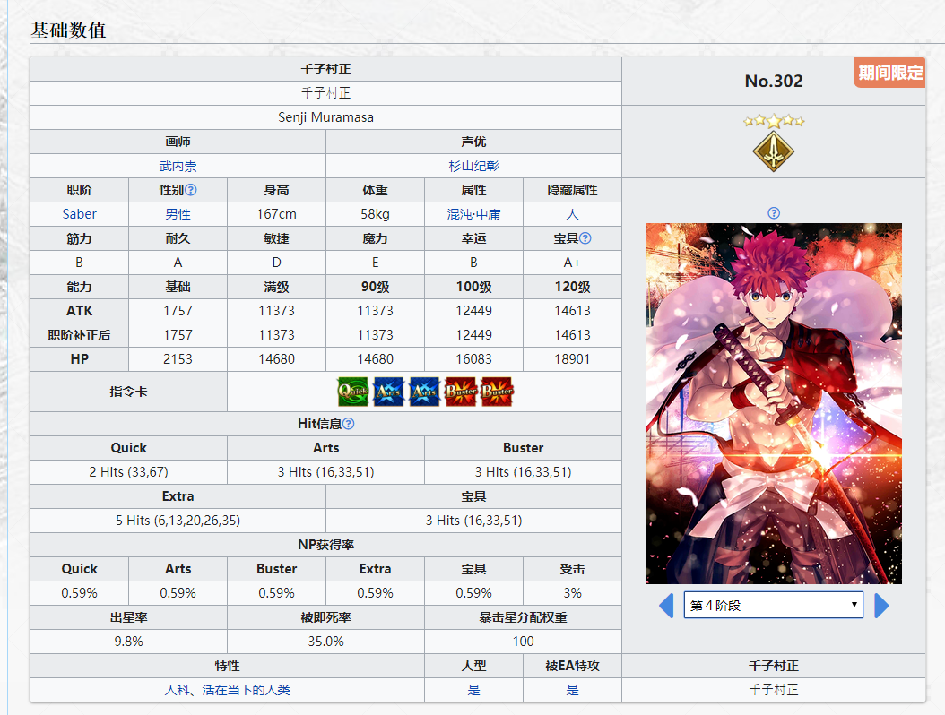 村正基础NP率为0.59%,指令卡配卡的是常规的二红二蓝一绿的配卡,红卡3hits、蓝卡3hits、绿卡2hits、EX卡5hits,宝具为蓝卡光炮宝具,宝具3hits,面板的NP率比较一般,是中规中矩的水平,但是因为村正三技能开启后每次普通攻击敌人(使用常规指令卡)就可以回复10NP,所以算下来村正NP率其实还是比较可观的,缺点是宝具无法享受三技能这个攻击回复NP效果,所以宝具的NP回收并没有特别强。