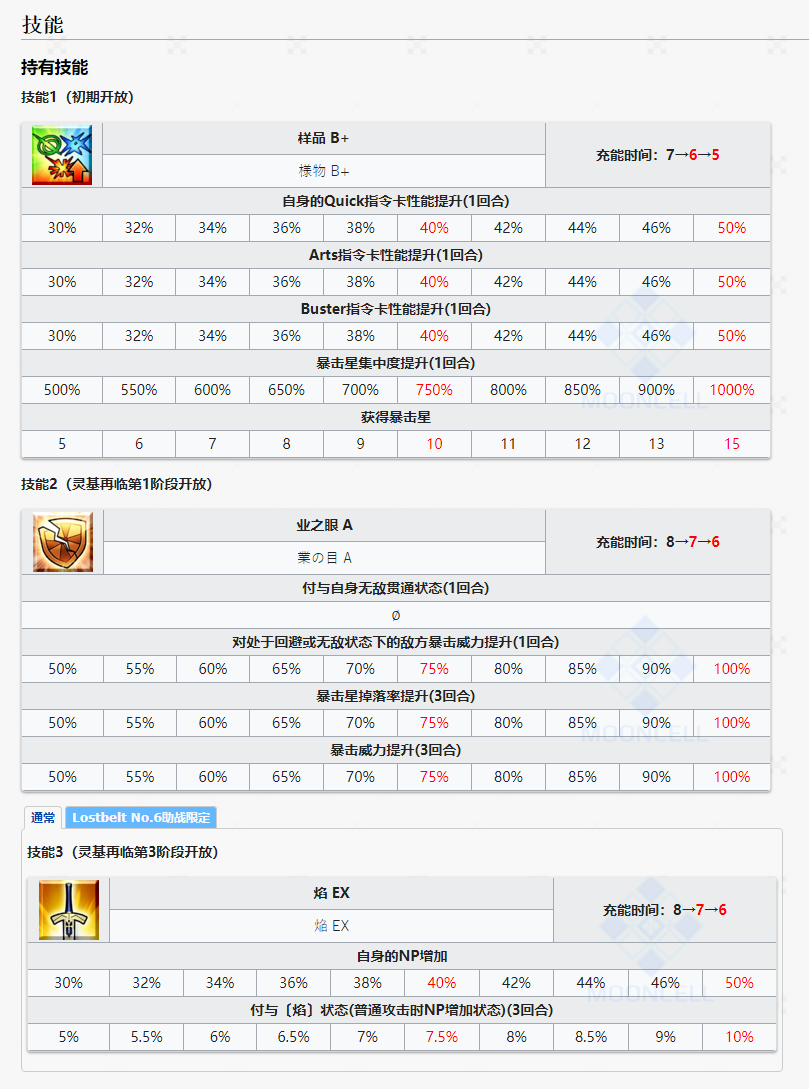三技能「焰 EX」自身增加50NP+赋予3回合「焰」状态,处于「焰」状态使用常规指令卡攻击敌人时可以增加5NP~10NP。