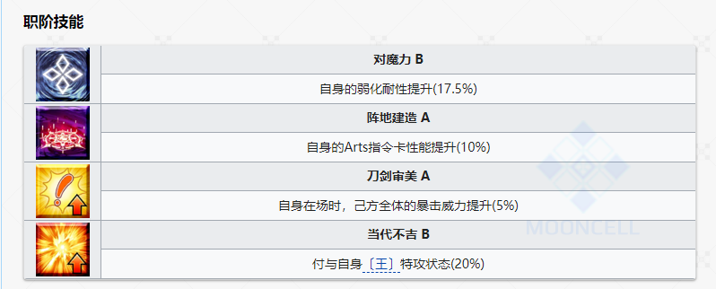 「阵地建造 A」常规蓝魔放被动,增加10%蓝魔放可以提升宝具、蓝卡的伤害和NP回收。