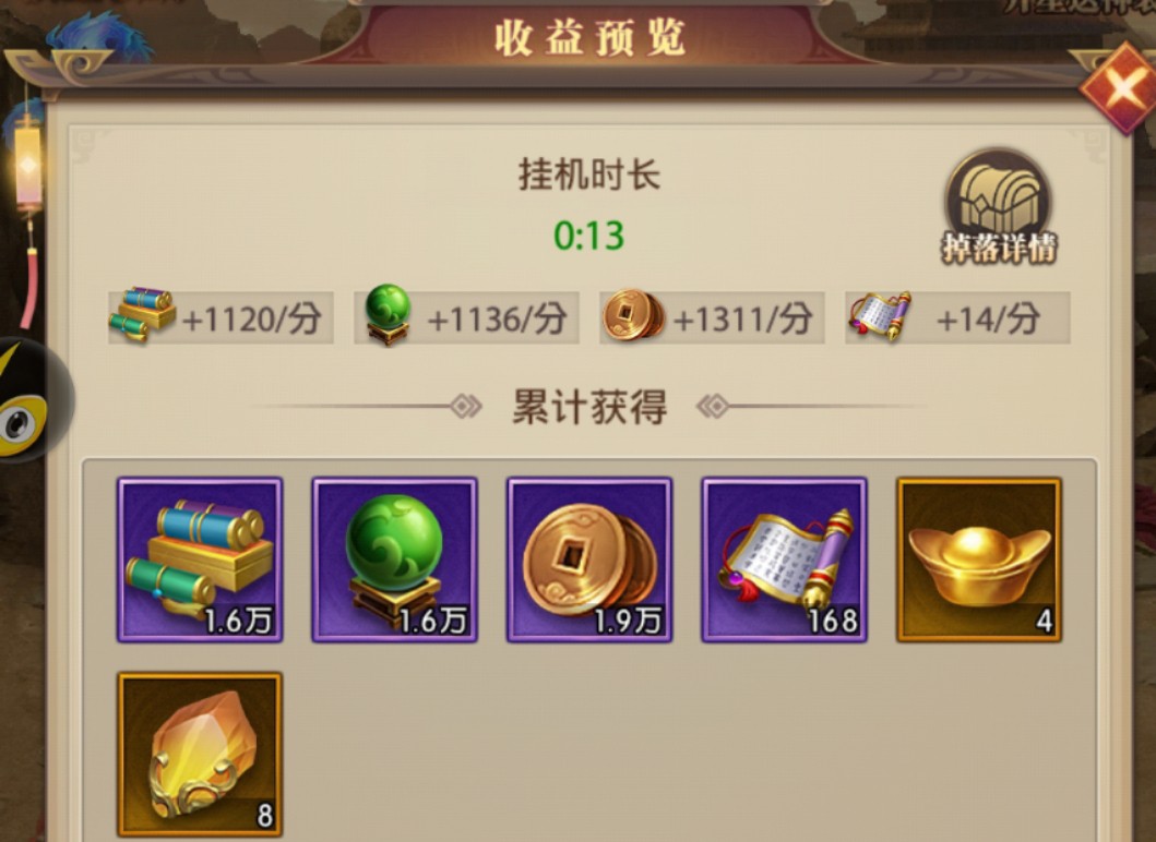 挂机可获得玩家/武将经验(个人/武将升级)、铜钱、功绩(1980功绩可领取一个奇遇任务)、元宝、突破石。通过关卡章节越高,挂机收益越高。