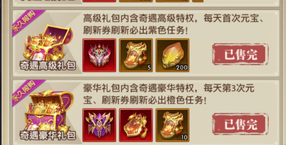 第一天奇遇高级,豪华礼包特权必买!(第五次刷新之后每三次之内刷新必出稀有、史诗、传说任务(传说任务需一个六星武将才可完成!)(通常三次内出一个,运气好一个以上)(不要想着有稀有保底就使劲刷新。。浪废刷新劵,元宝,。元宝用不完当我没说。。)