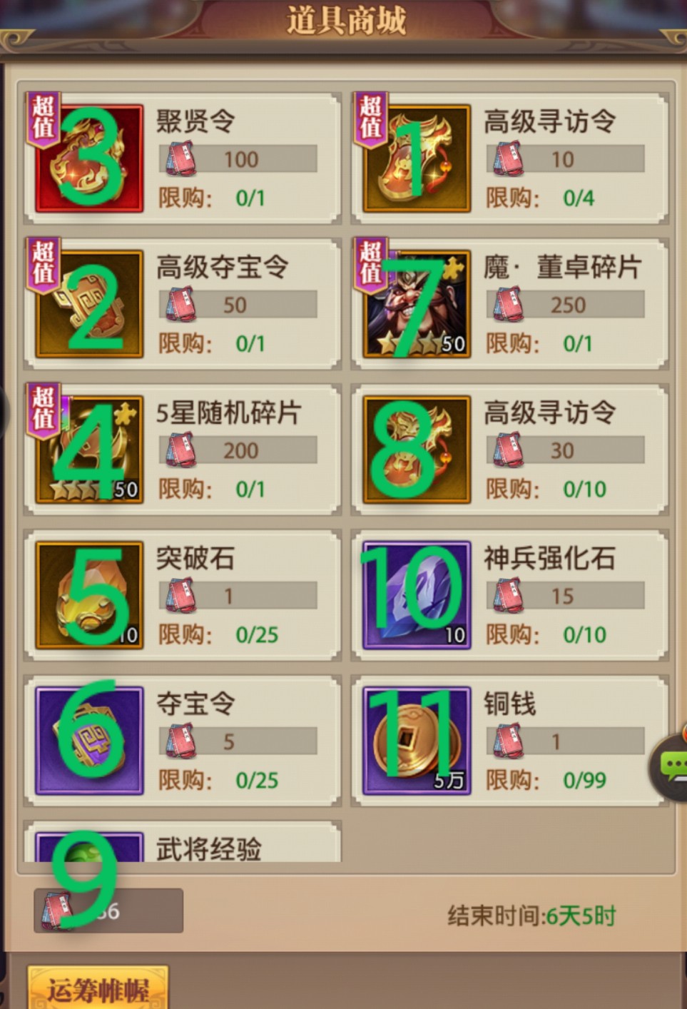 50高级武将碎片、高级武将招募令根据个人需要酌情购买。突破石前期急缺可购买,夺宝令、武将经验每次必买。