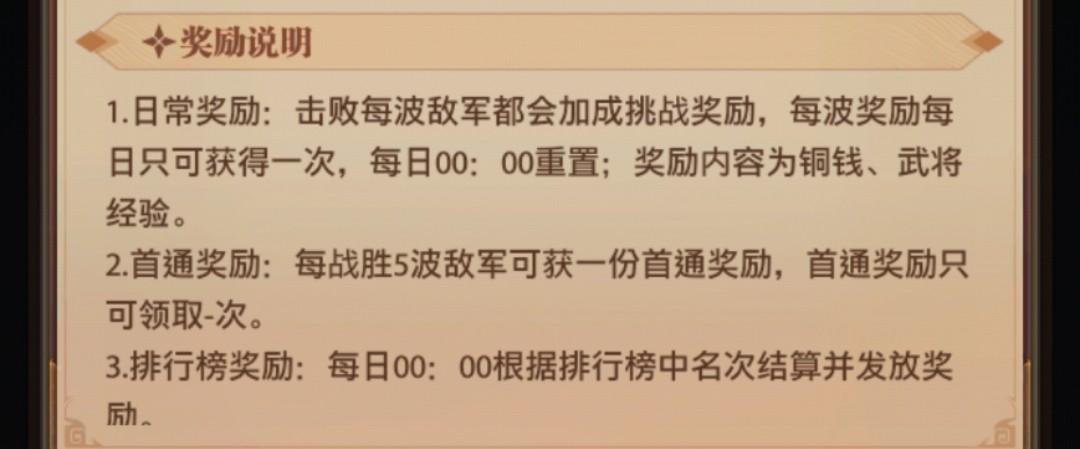 千里单骑由普通、精英、噩梦三种挑战难度组成,每日通关可获得大量积分,铜钱。