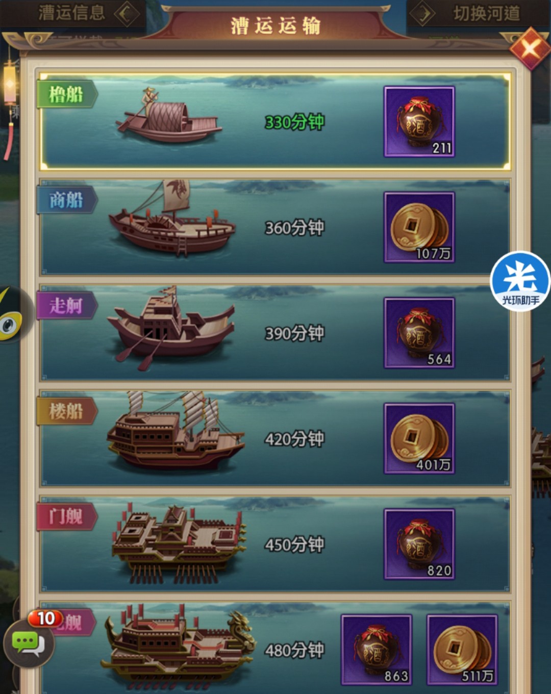 第一次橹船运输为零元宝,其他依次需要10、20、40、60、200元宝。前面可花元宝点到龙舰,一两周后弄走舸,楼船即可。