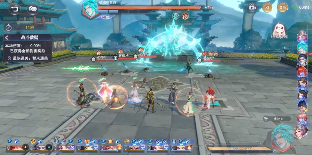 当【破魂】达到3层时,boss会无消耗的使用一次主动技能,并立刻清空所有【破魂】状态,因此限制杨无敌的行动和魂力便是提升我方生存力的最大保证,这里特别提一句boss的主动群体技能伤害还是非常猛,维一的练度基本上挨2次就团灭了