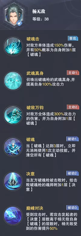 主动技能有2个,第1是召唤武魂真身破魂枪,第2是对我方造成300%攻击力的伤害,并为自身附加1层【破魂】