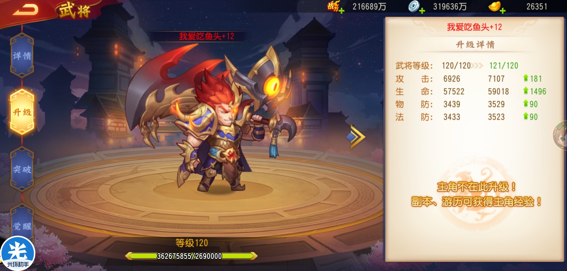 等级的提升自然可以带来属性上的提升,并且随着等级的提升,红色武将的提升会比橙色武将的提升高得多(主角是橙色武将)。