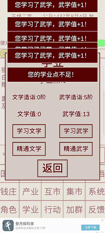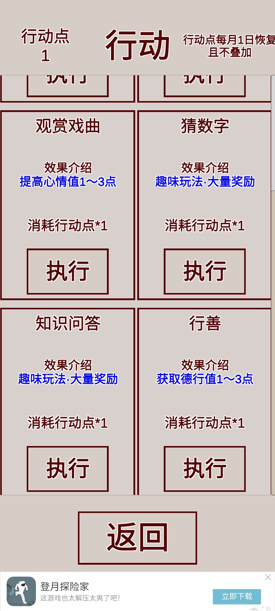 学业里可以升级文学或武学,升级后能够满足当官的要求;行动里可以赚钱,换去威望、德行,这些对于后期升官有帮助;家族里可以查看父母状态、家中余粮已经存款;官爵里可以提升官位完成任务。
