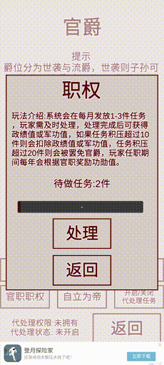 进入游戏新建存档后需要玩家自己命名游戏人物,建立完人物系统会自动生成人物家属、背景等信息。游戏的界面很简单,主要就是文字。主线是玩家要操控人物一步一步的提升自己的地位、财富,最终登基称帝。