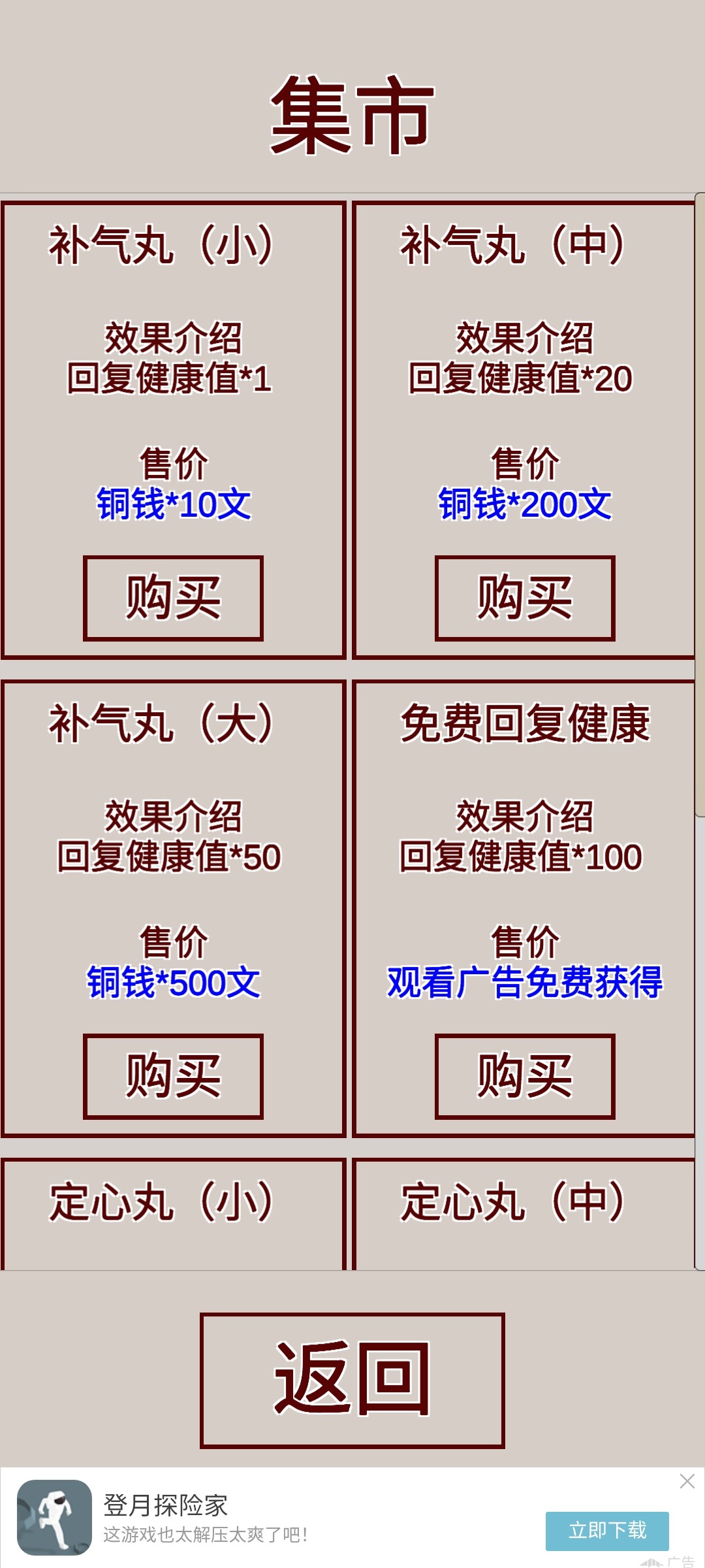 该游戏还有一特点,那就是有生命体征,健康指数太低会死。父母那边只要有粮食就不会掉健康值,但是主人公随着时间流逝会掉健康值,所以要在商店购买补气丹,恢复健康值。