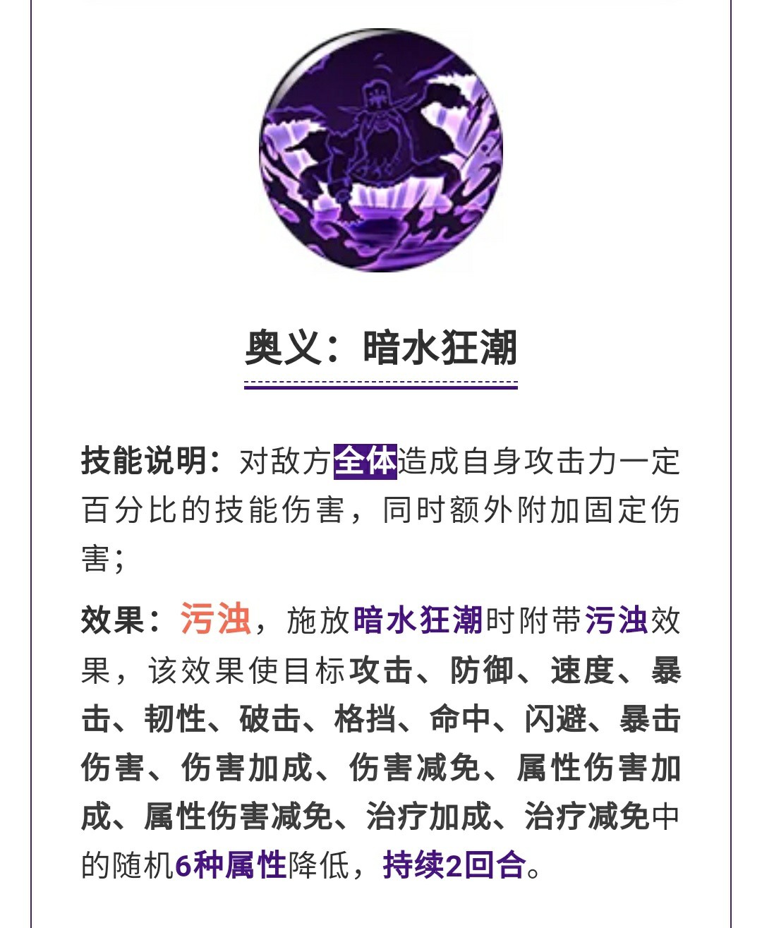 奥义·暗水狂潮全体奥义,同时会叠加负面效果,从16种属性中随机选6种降低,不得不说这又是一个赌脸的技能了,这个技能如果能减到攻击和速度应该是挺不错的,但是减了韧性格挡之类的好像没啥作用,同时还持续2回合