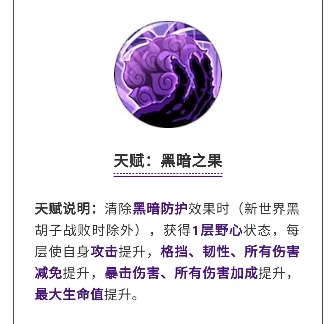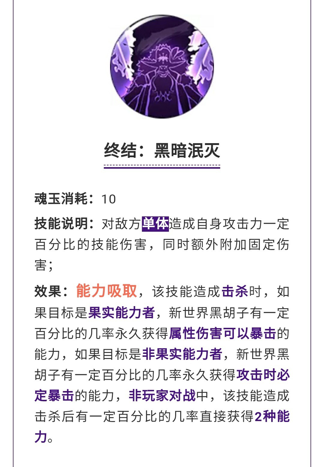 终结·黑暗泯灭单体终结,这个终结就是跟原创的黑胡子差不多,剥夺果实能力者的能力,不过这里比较简单的写了,如果技能造成击杀的是果实能力者那么黑胡子属性伤害可以暴击,如果是非果实能力者那么就加成必爆,在pve中两种都可以叠加。