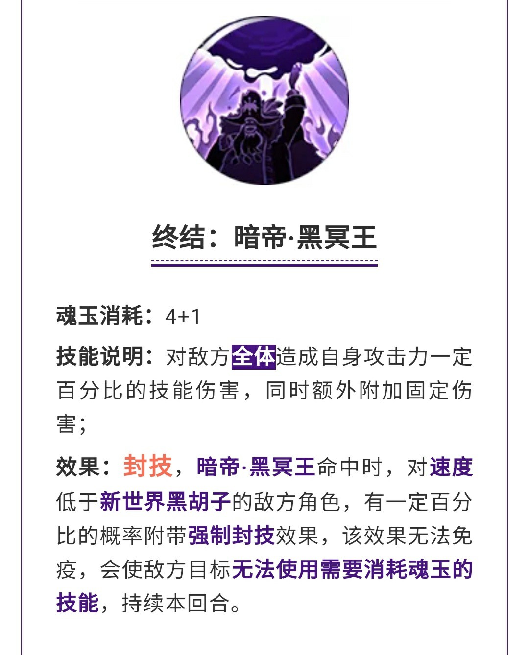 终结·暗帝·黑冥王直接全体无视你的无视直接强制封印,不过前提是速度要比黑胡子慢才可以封的住,但是描述也写了不能使用消耗魂玉技能也就是说可以直接用奥义。