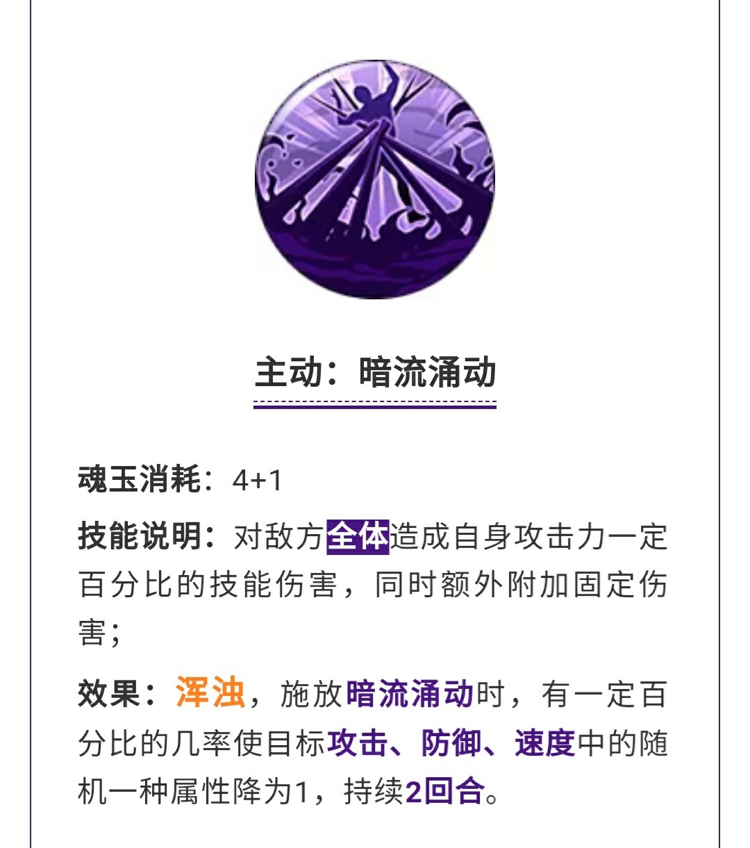主动技能·暗流涌动5魂的全体技能,同时命中敌人有概率让攻击、防御、速度随机一种变为1,而且持续两回合。